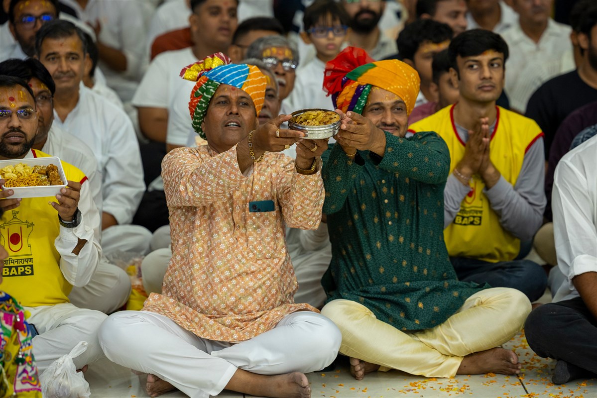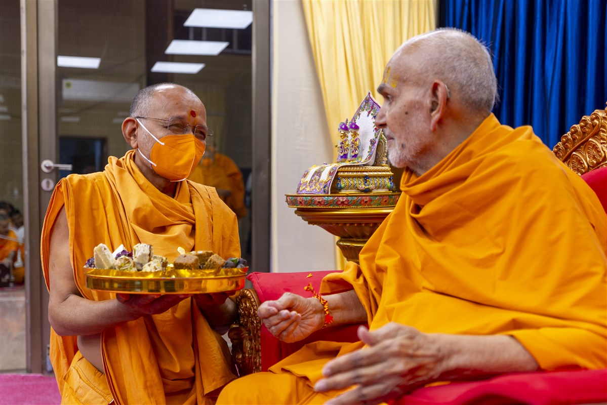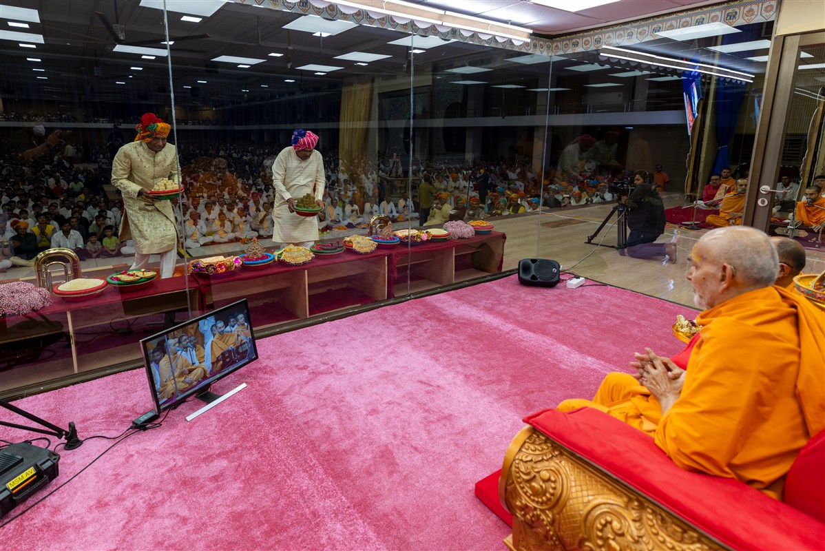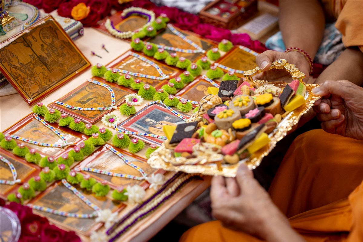 Swamishri offers thal to Shri Akshar-Purushottam Maharaj