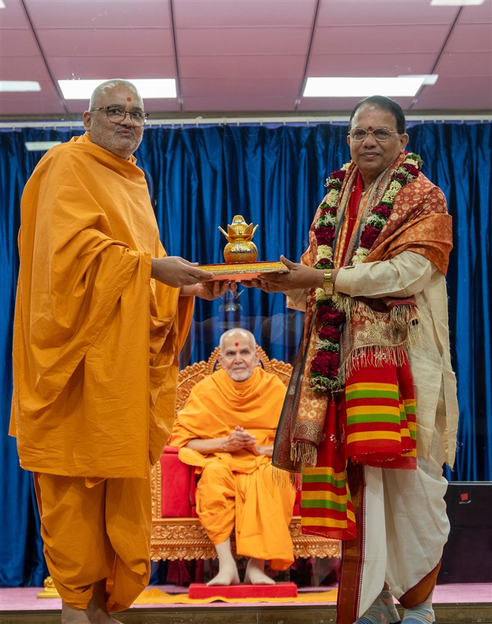Bhadresh Swami presents a kalash to Professor Harekrishna Satpathy