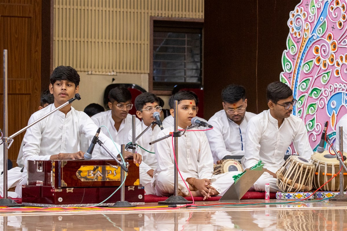 Children sing kirtans at the beginning of the evening welcome assembly