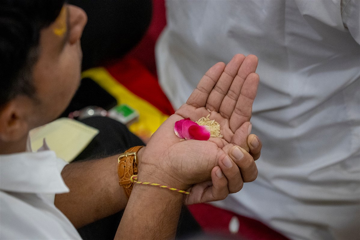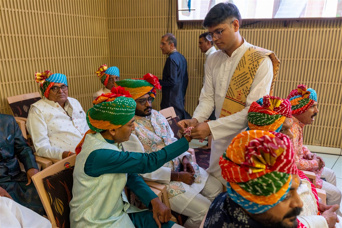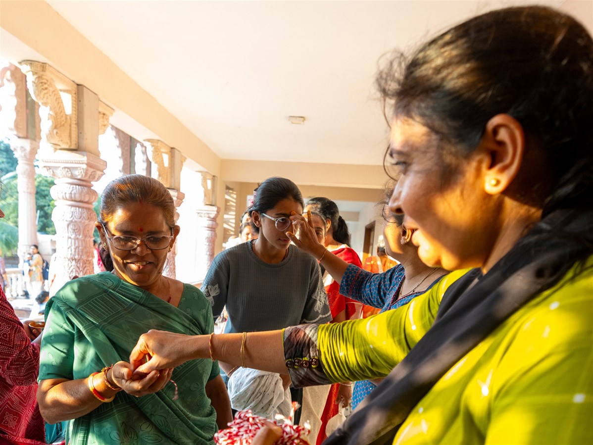 A volunteer ties a nadachhadi to a devotee
