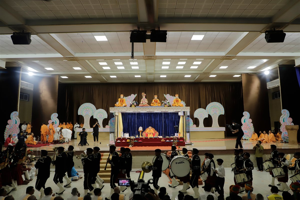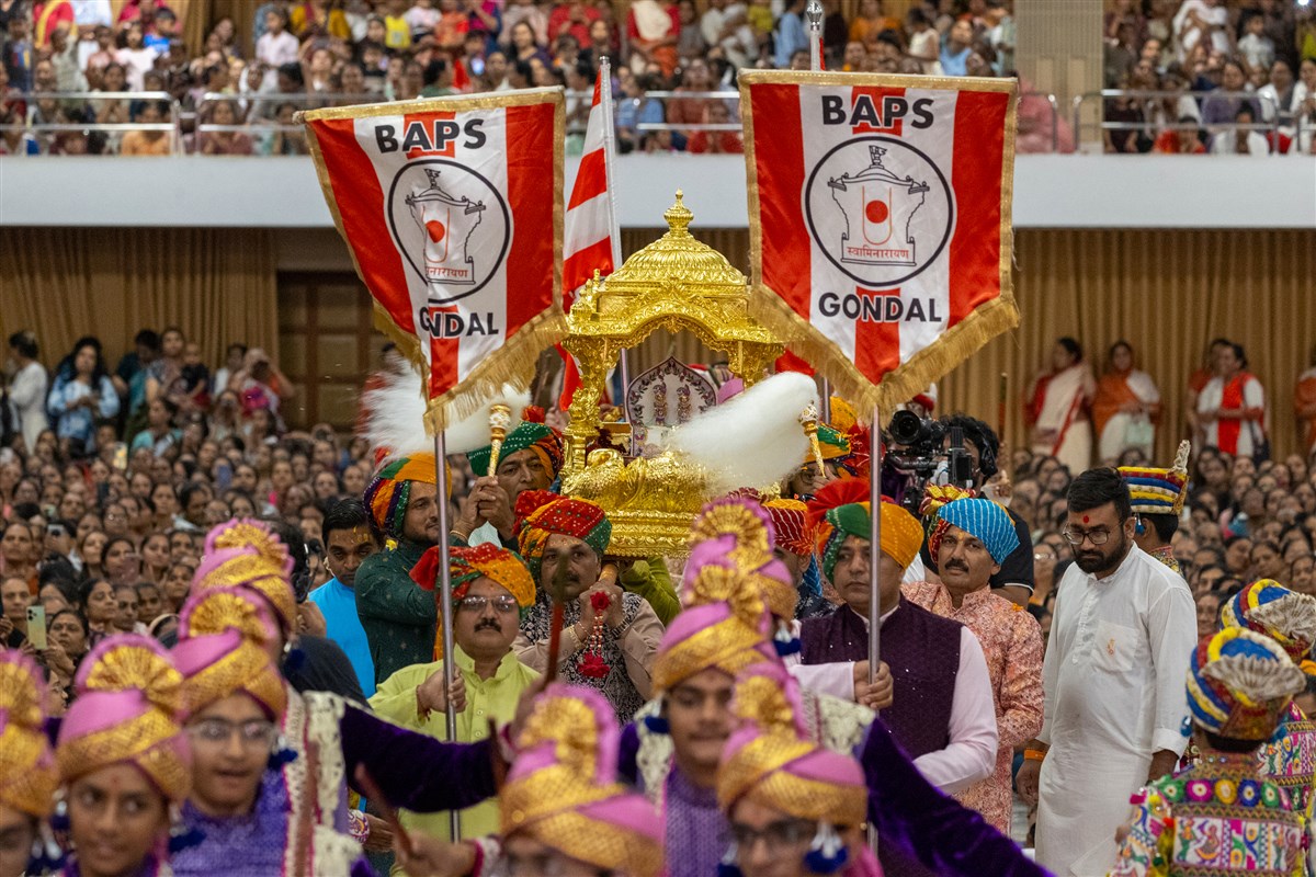 Swamishri arrives in the assembly hall