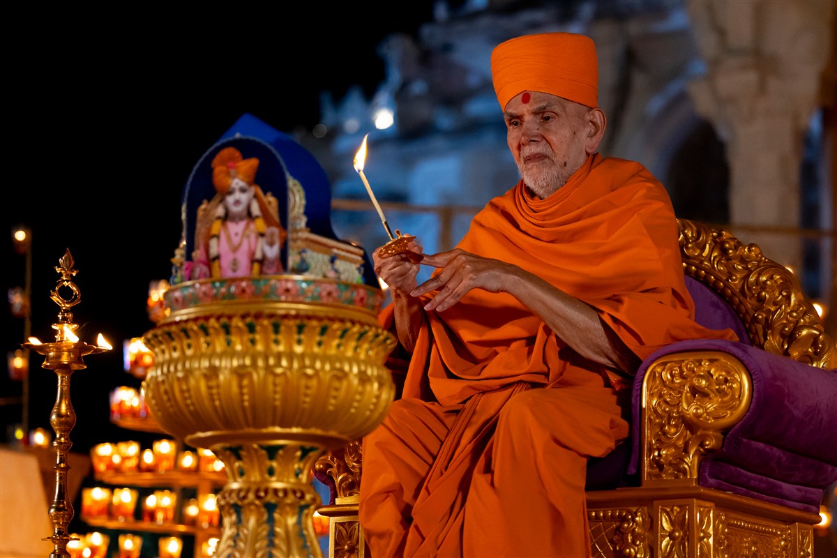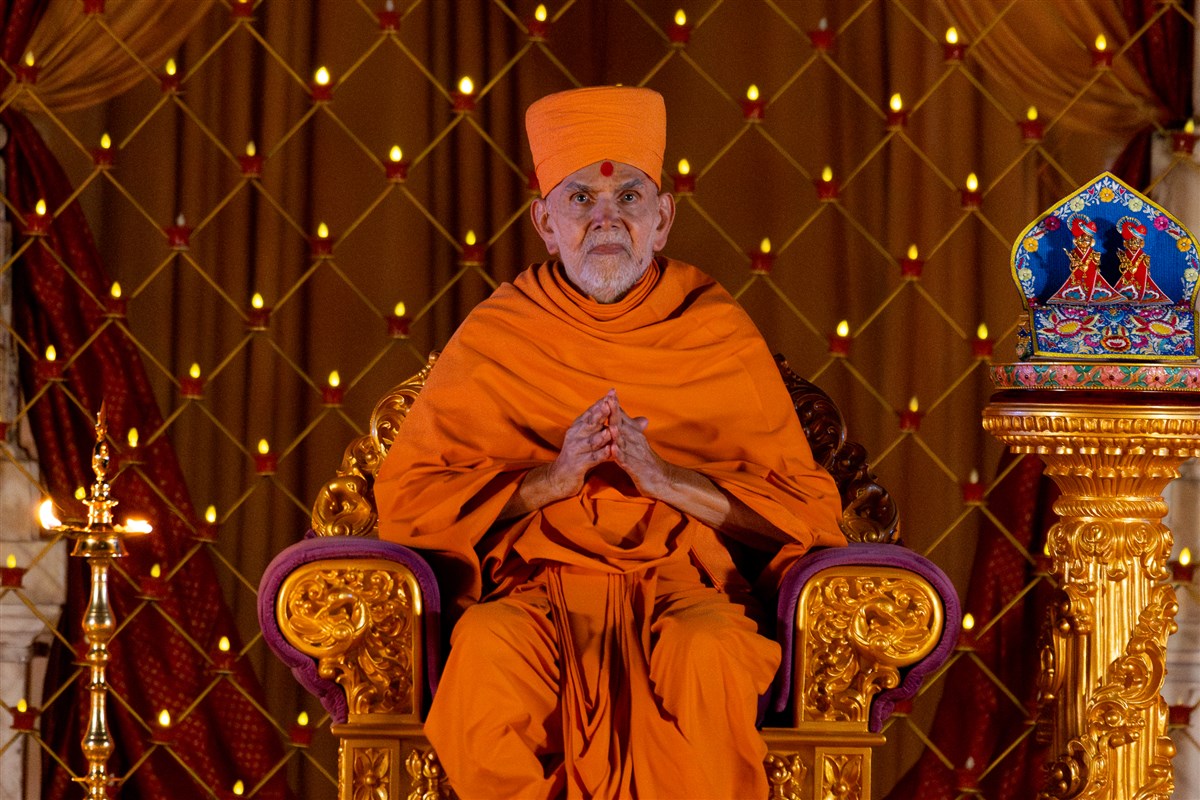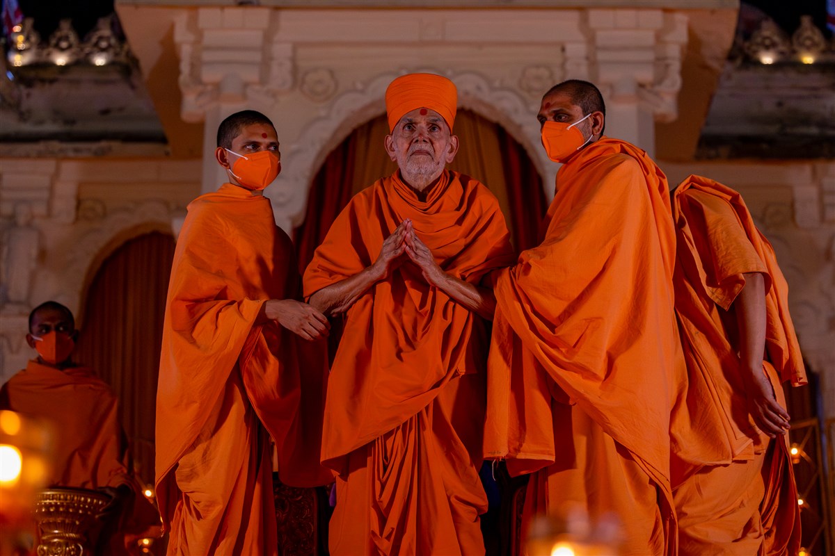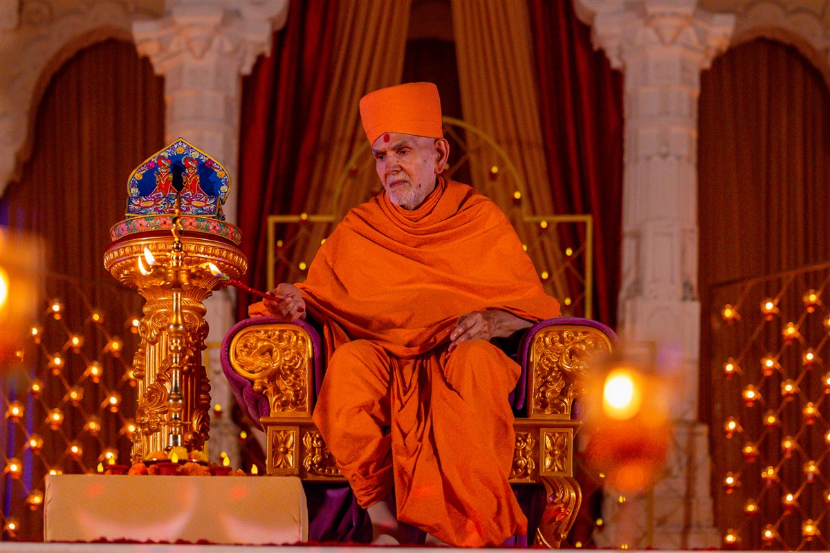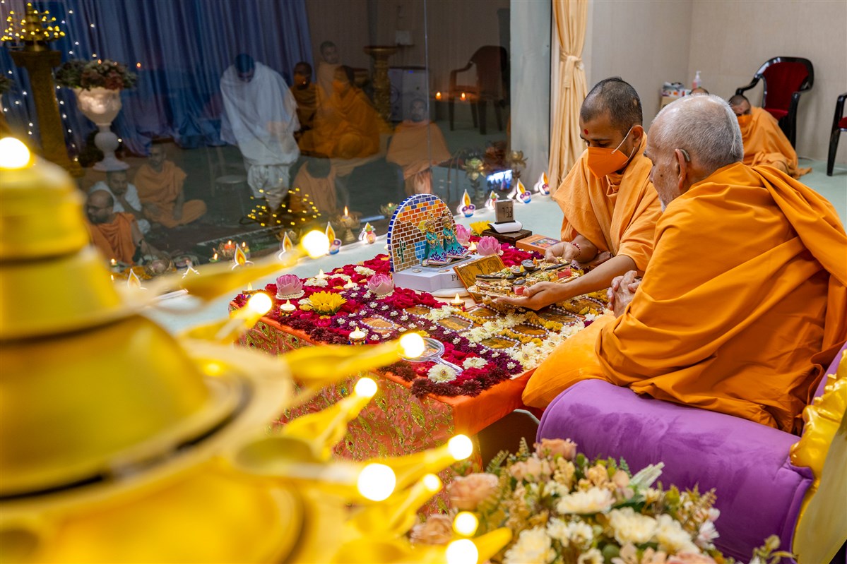 Swamishri offers thal to Shri Akshar-Purushottam Maharaj