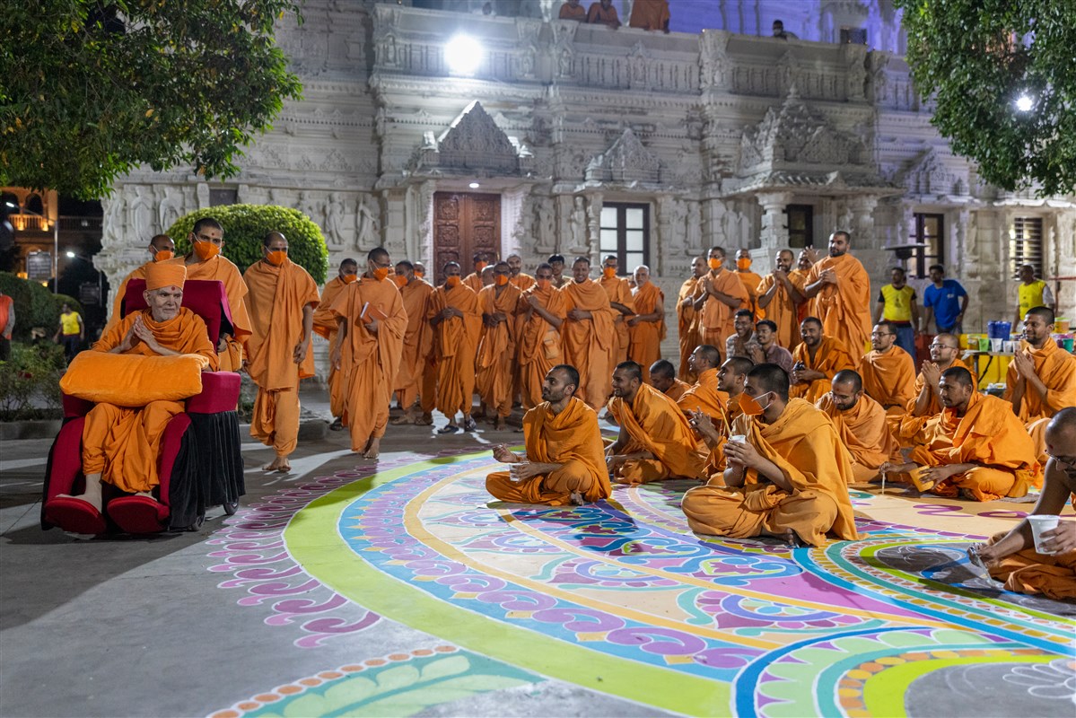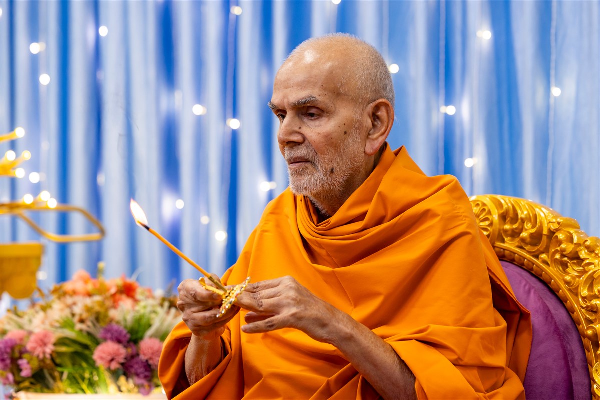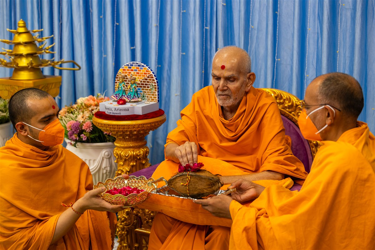 Swamishri sanctifies a coconut for Vishwashanti Lakshmihom Mahayagna
