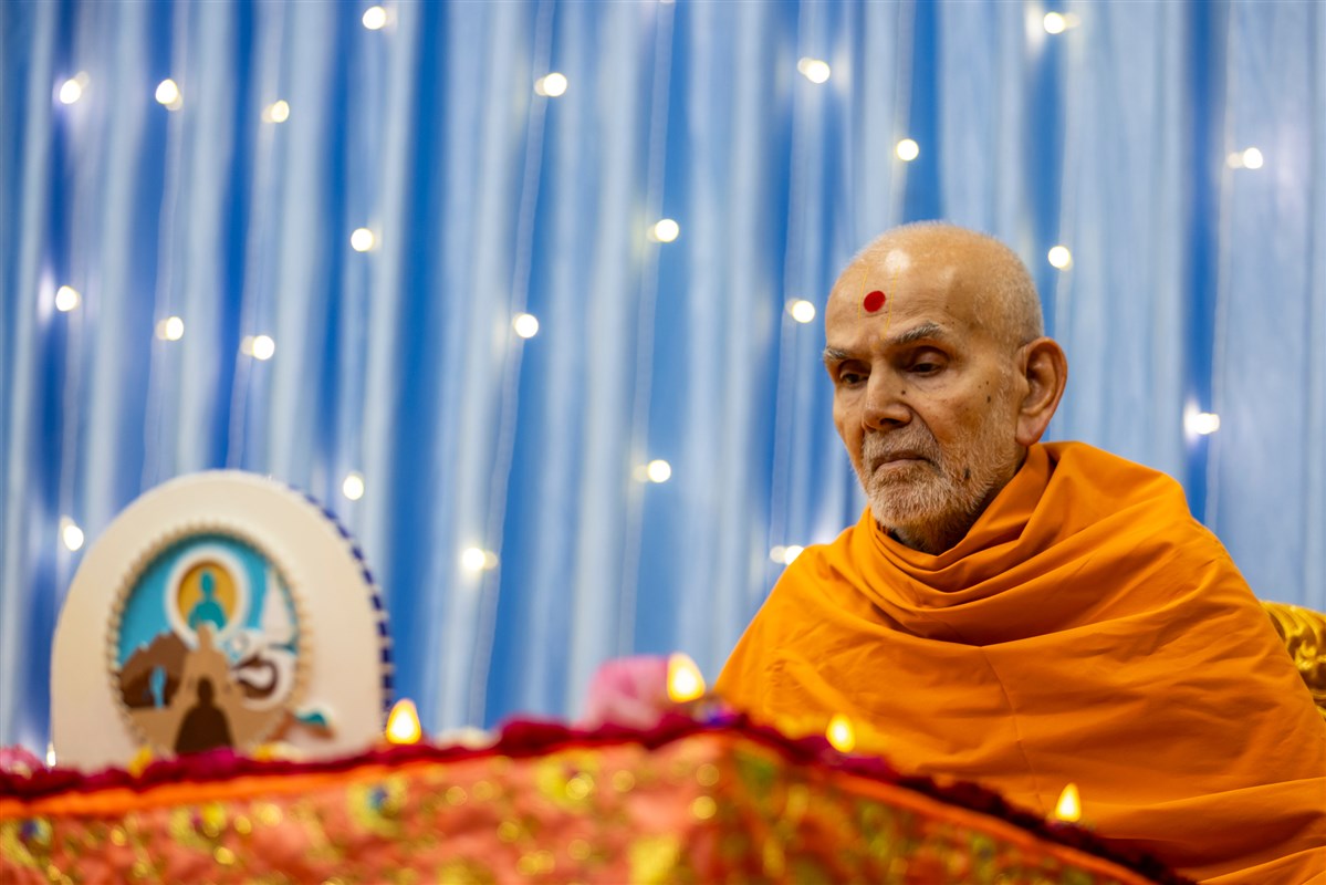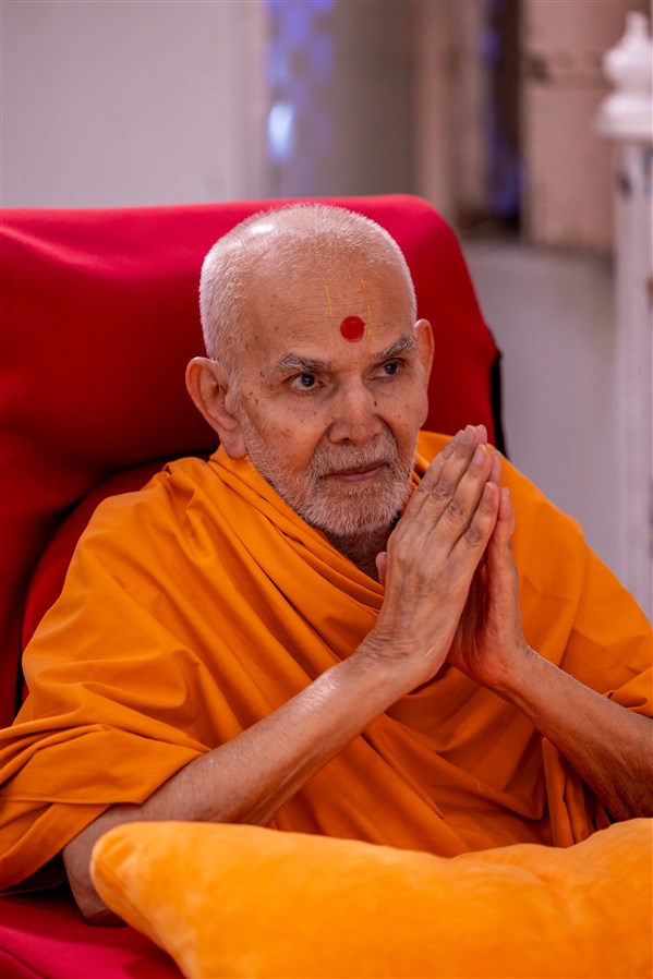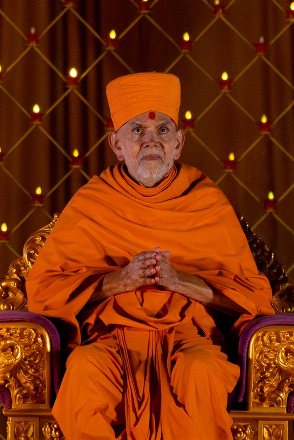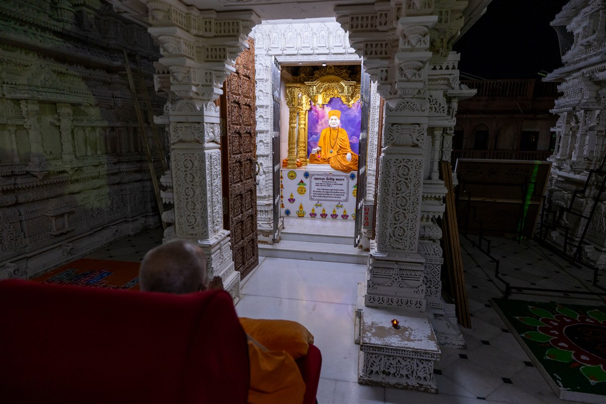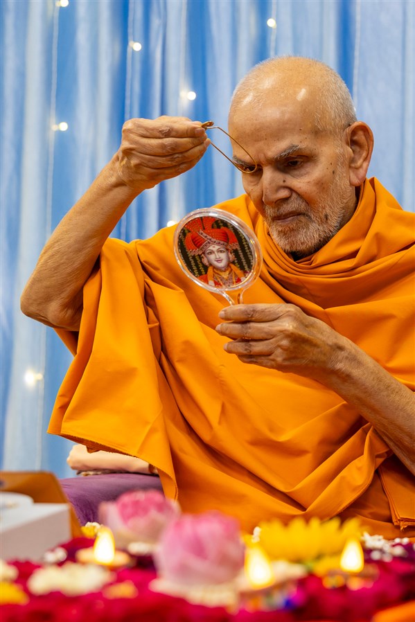 Swamishri engrossed in darshan of Shri Harikrishna Maharaj and Shri Gunatitanand Swami Maharaj