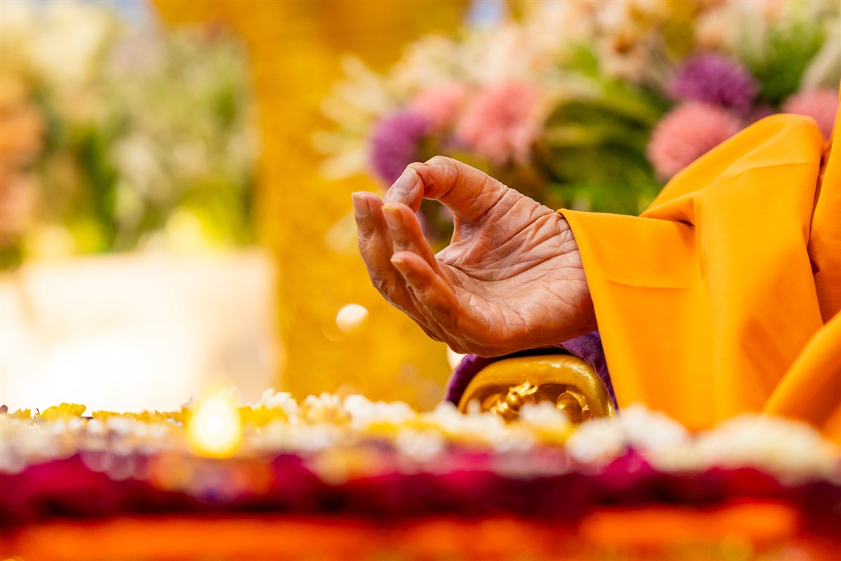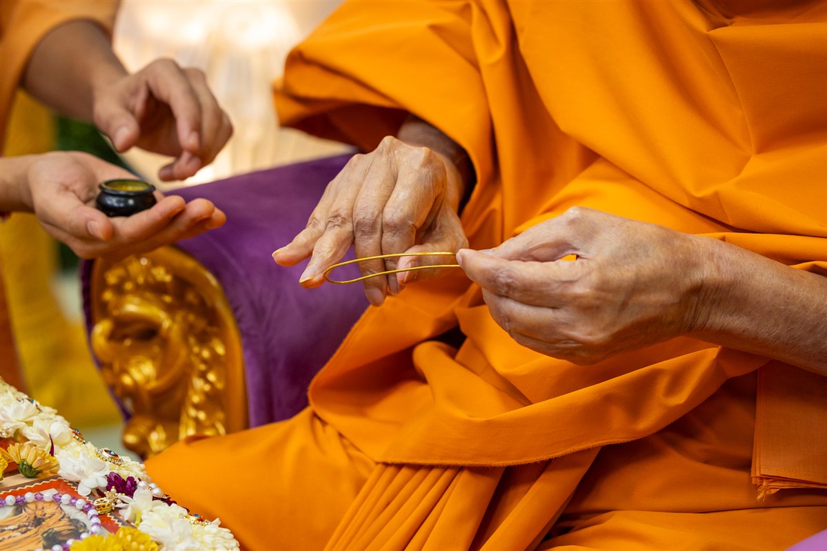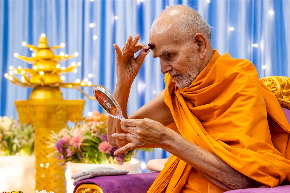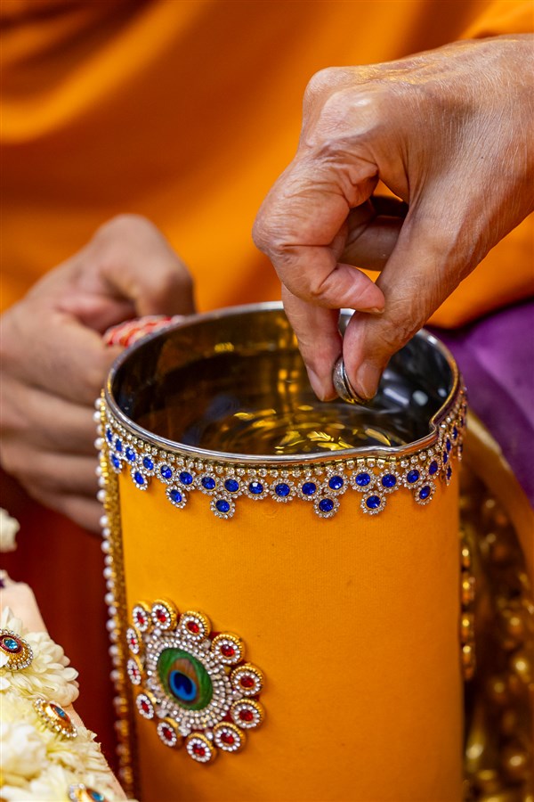 Swamishri sanctifies water with the holy relics of Bhagwan Swaminarayan and the Guru Parampara