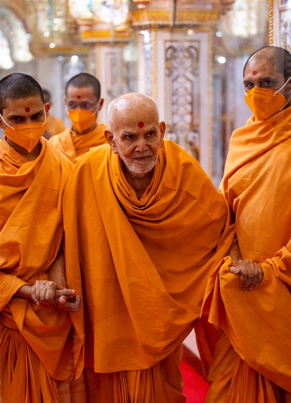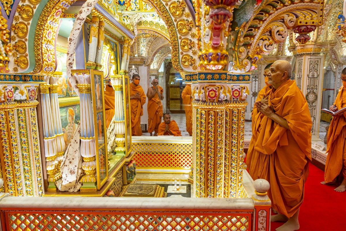 Param Pujya Mahant Swami Maharaj engrossed in darshan of Shri Harikrishna Maharaj and Shri Gunatitanand Swami Maharaj