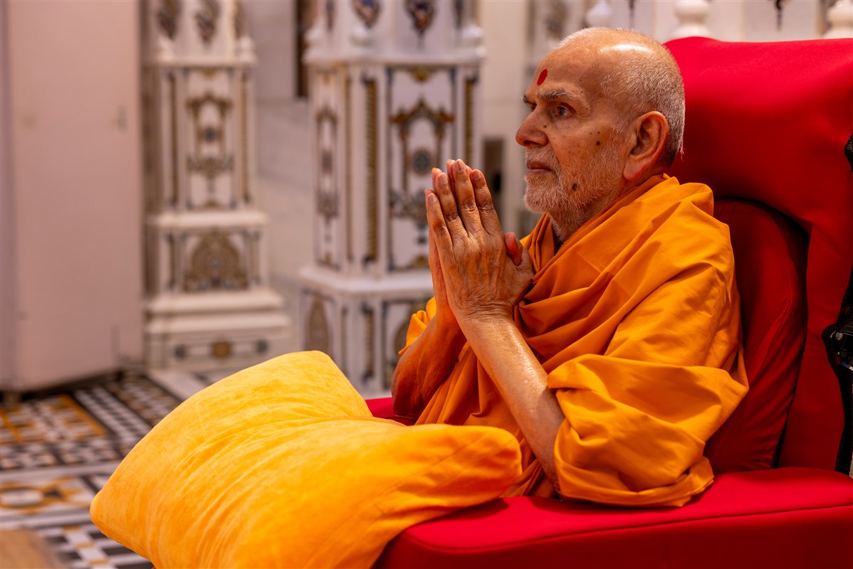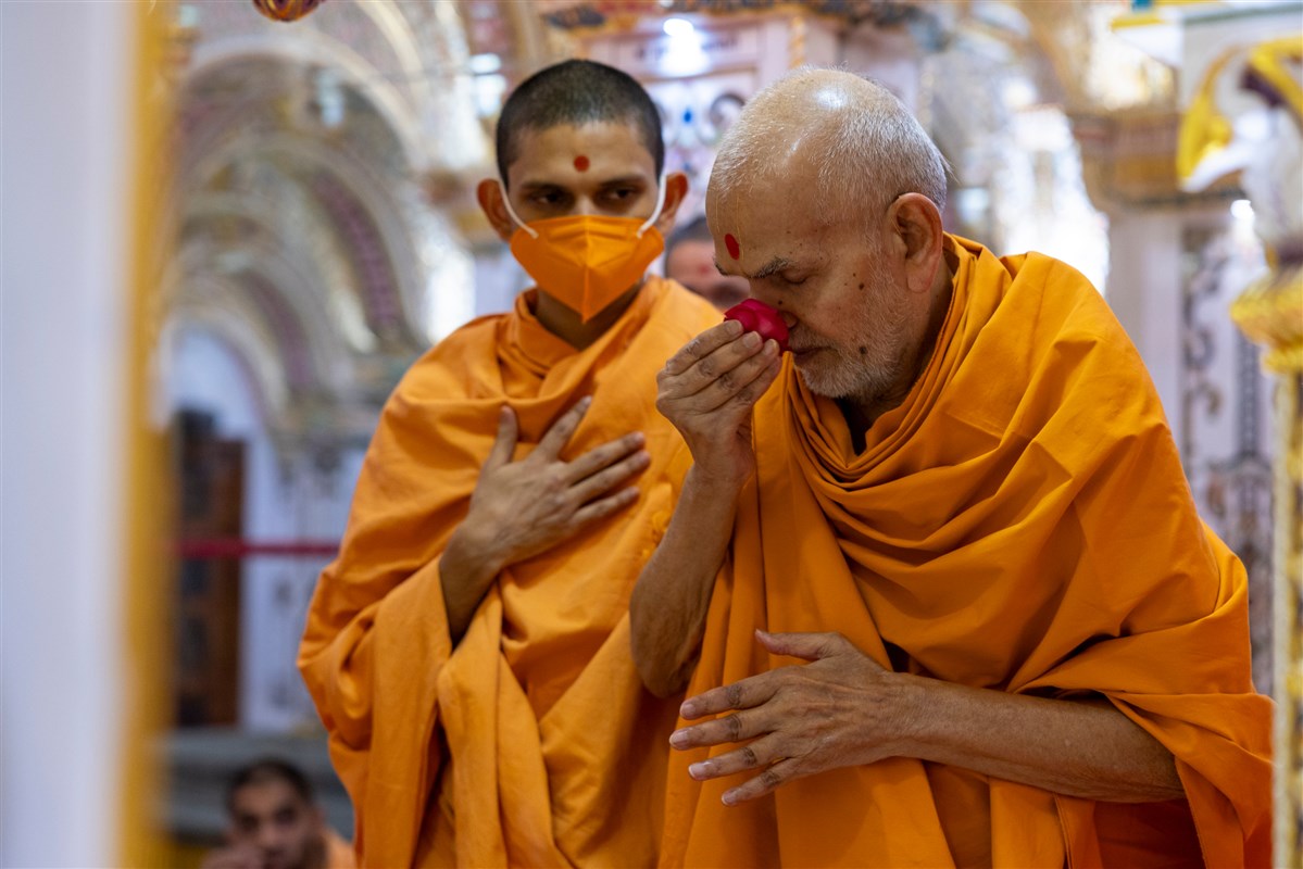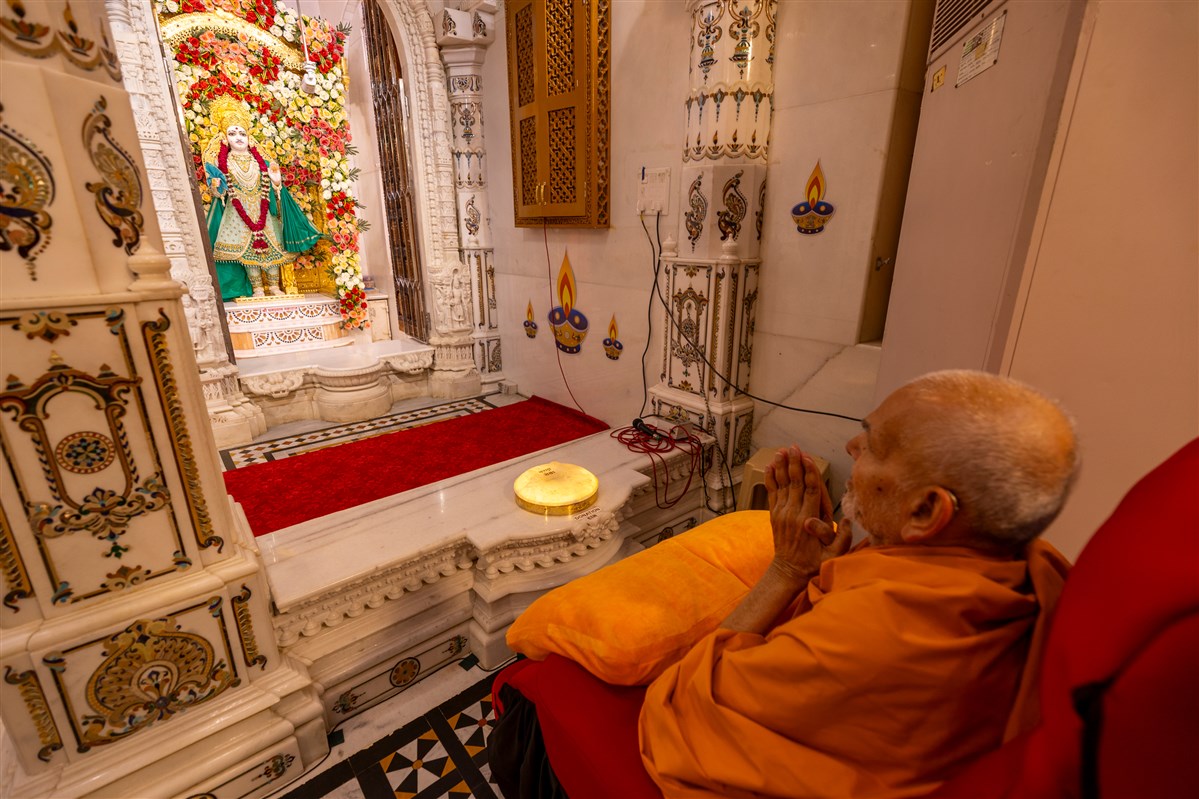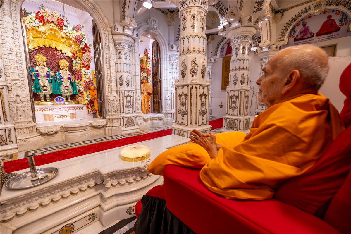 Swamishri engrossed in darshan of Bhagwan Swaminarayan and Aksharbrahma Gunatitanand Swami
