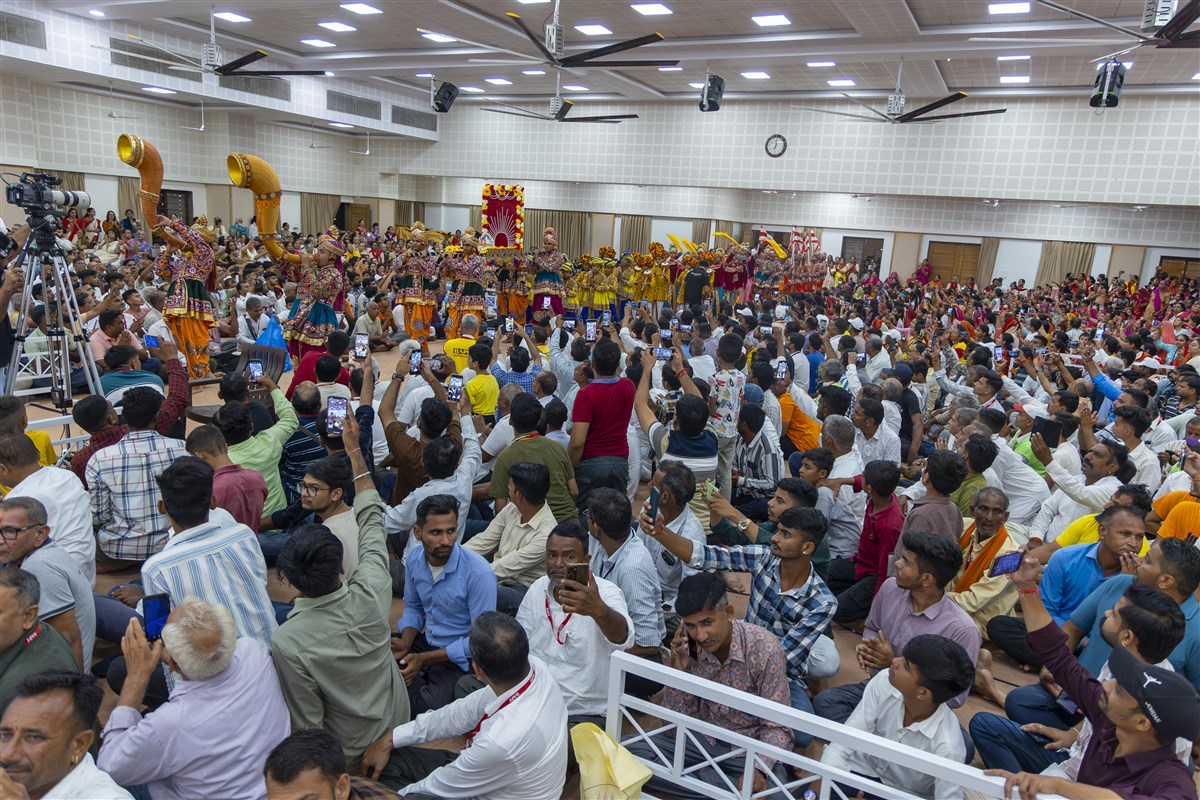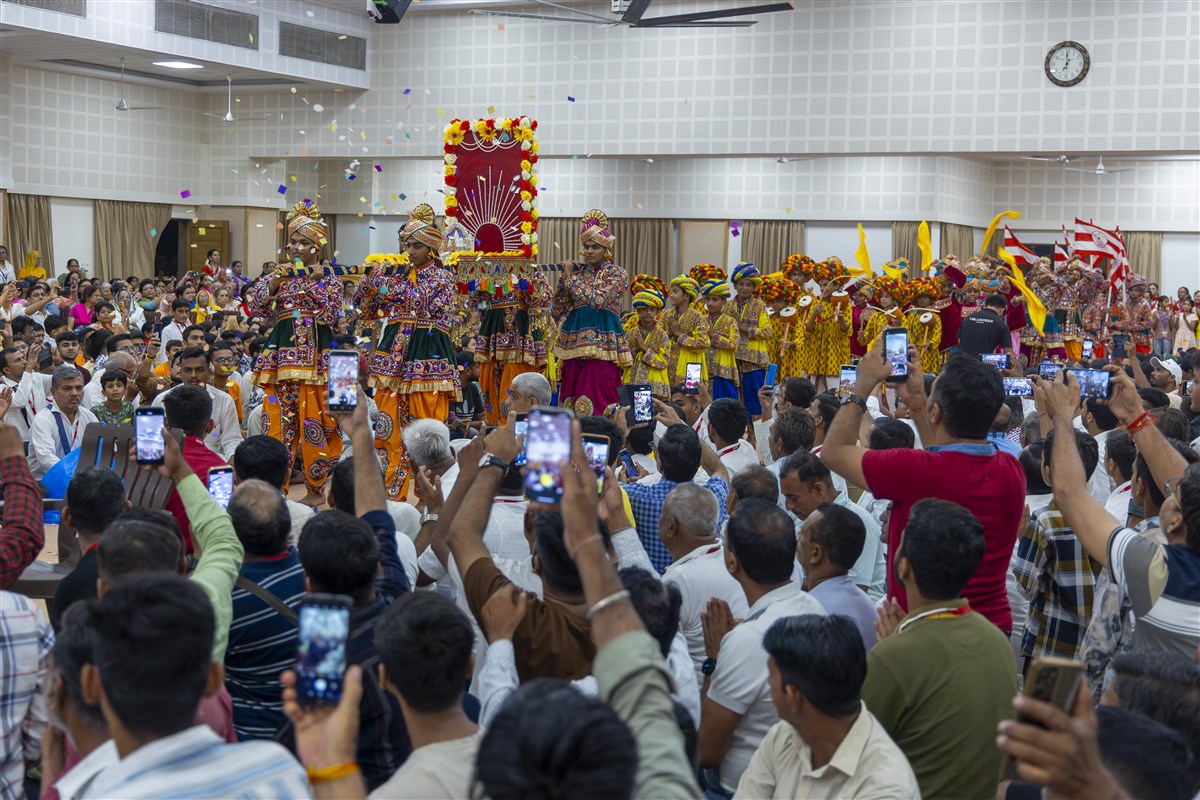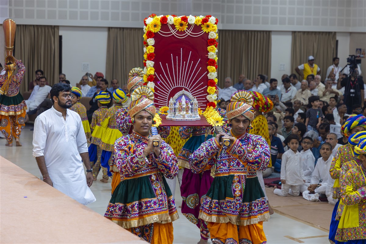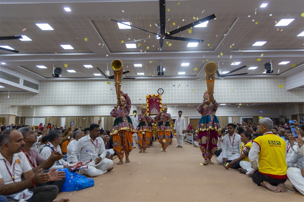 Devotees welcome Shri Harikrishna Maharaj and Shri Gunatitanand Swami Maharaj in the assembly