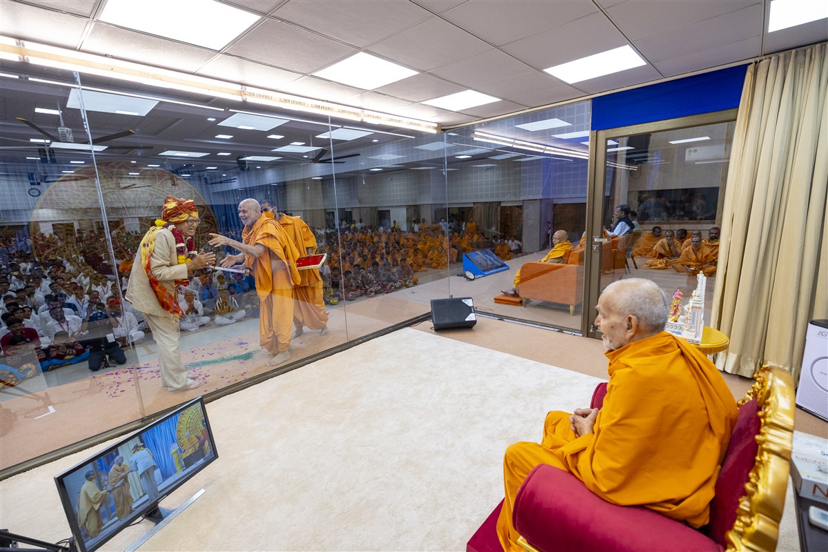 Swamis honor Swamishri with a garland