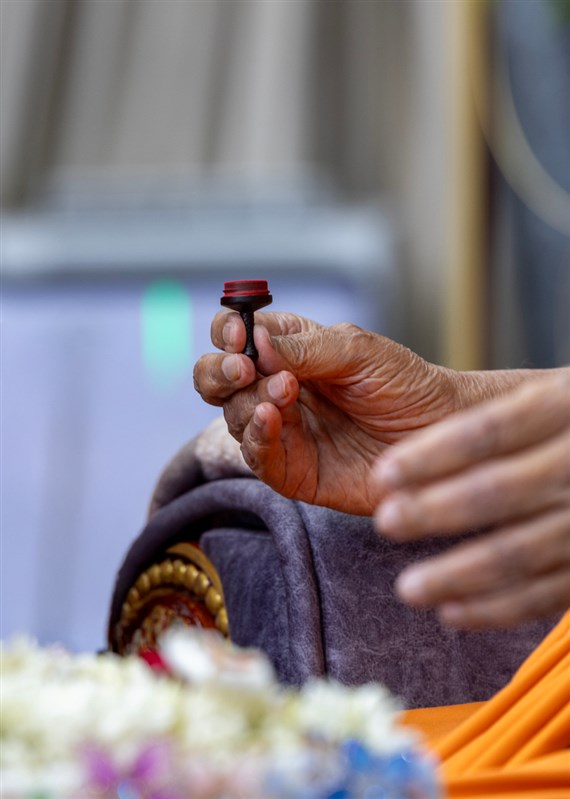 Swamishri sanctifies water with the holy relics of Bhagwan Swaminarayan and the Guru Parampara