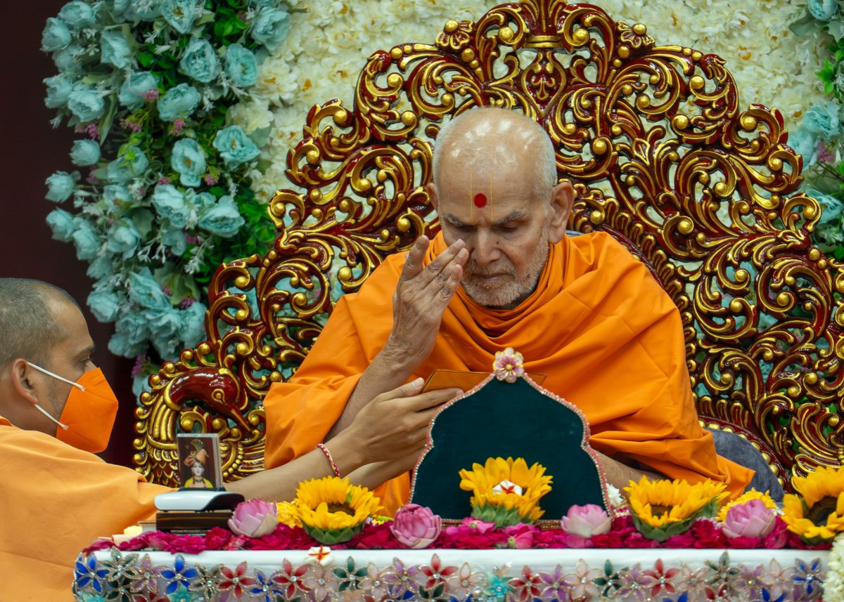 Swamishri engrossed in darshan of Shri Harikrishna Maharaj and Shri Gunatitanand Swami Maharaj