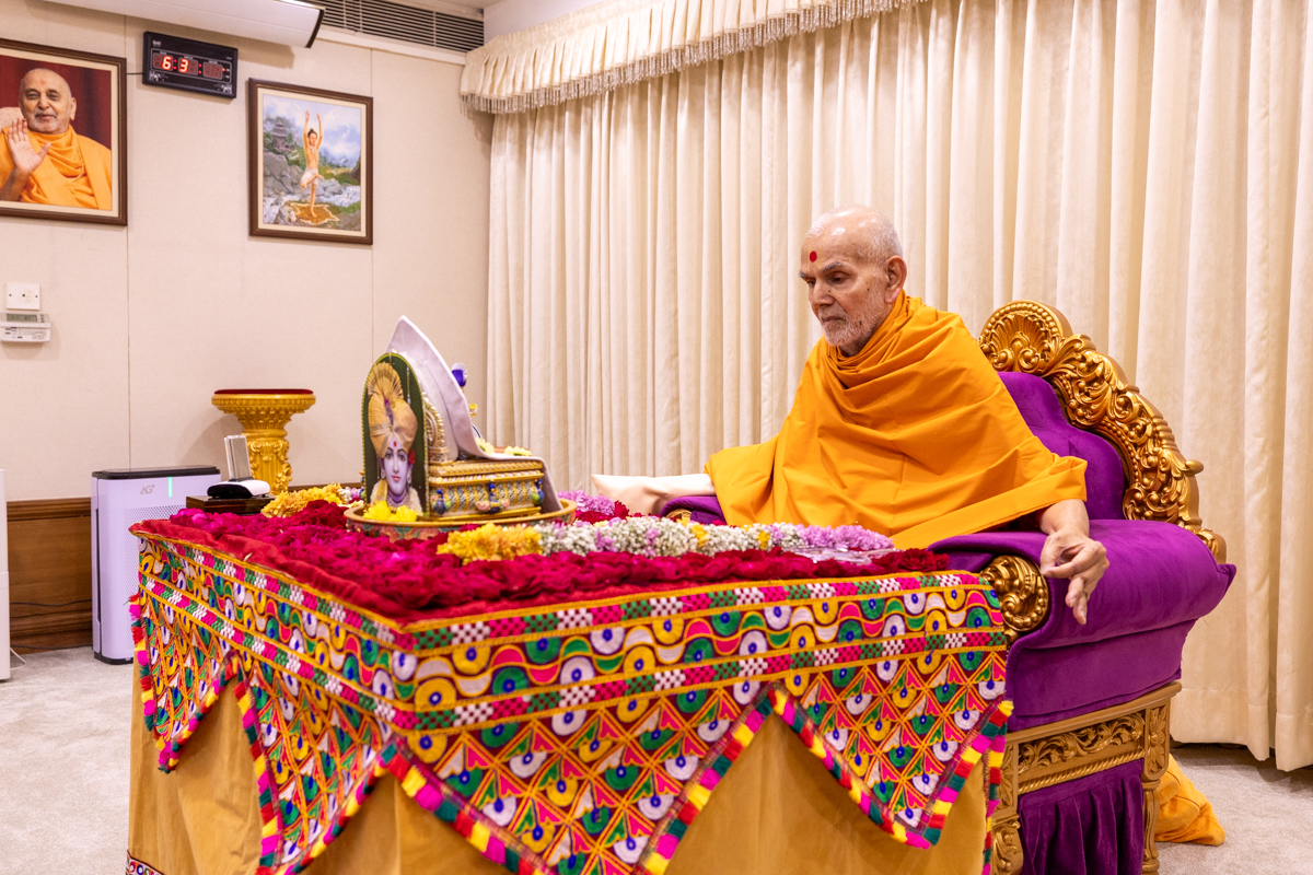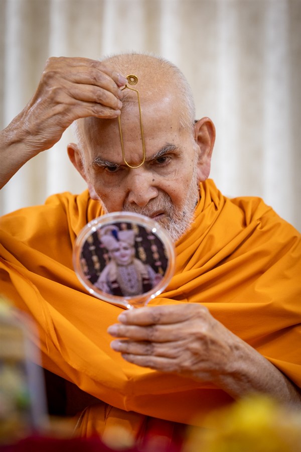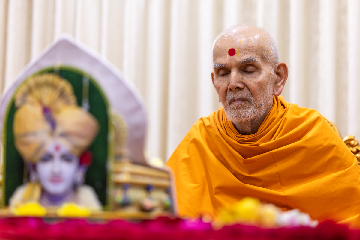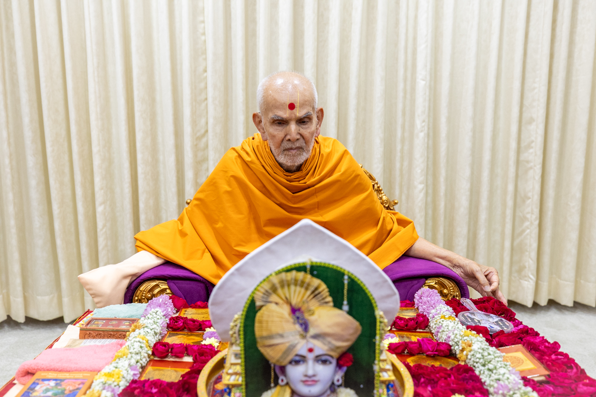 Swamishri engrossed in darshan of Shri Harikrishna Maharaj and Shri Gunatitanand Swami Maharaj