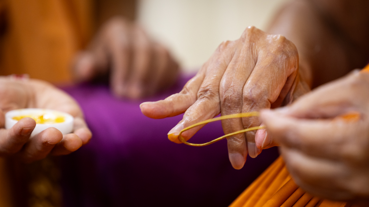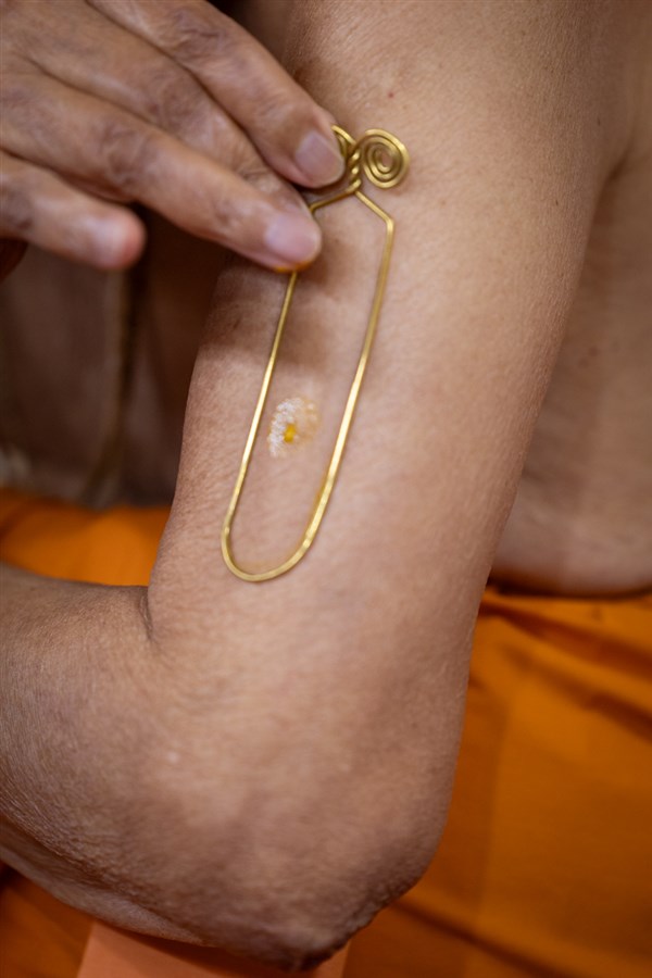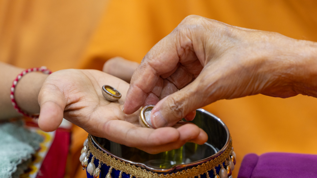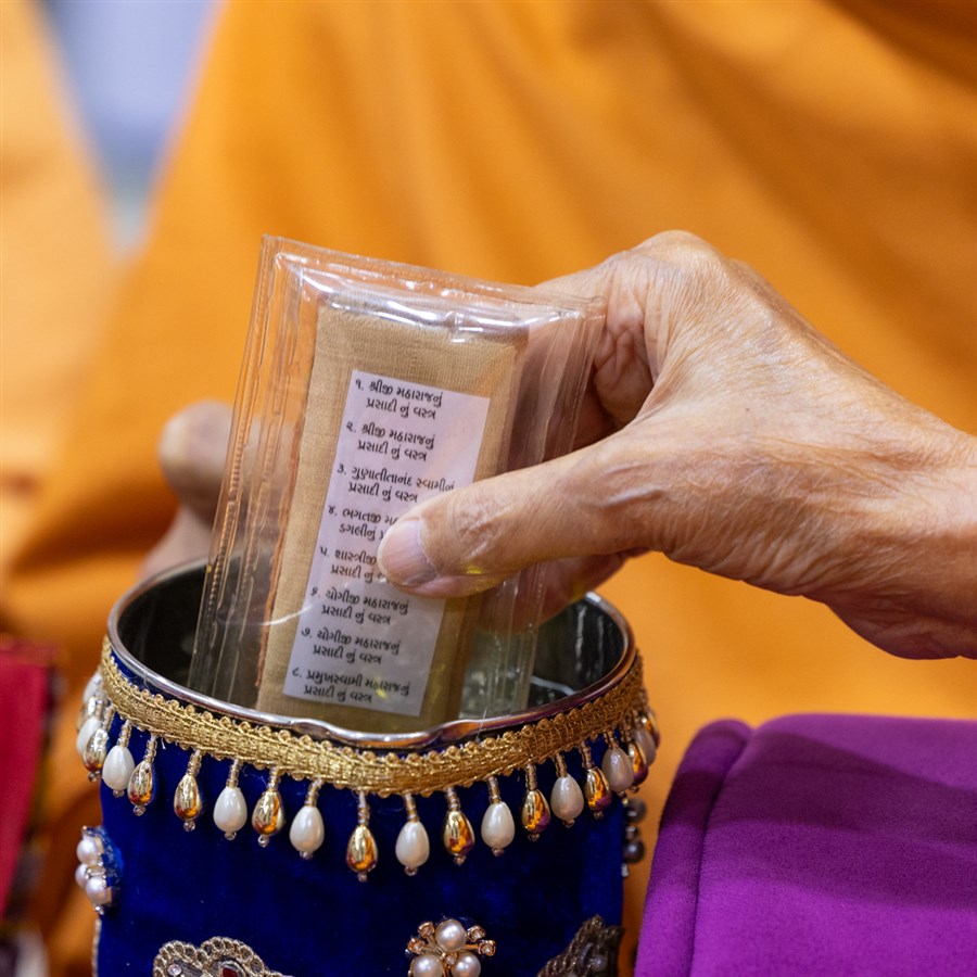 Swamishri sanctifies water with the holy relics of Bhagwan Swaminarayan and the Guru Parampara