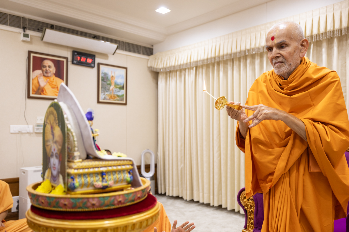 Pujya Ishwarcharan Swami doing Swamishri's puja darshan