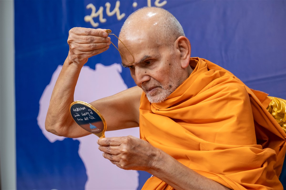 Swamishri sanctifies water with the holy relics of Bhagwan Swaminarayan and the Guru Parampara
