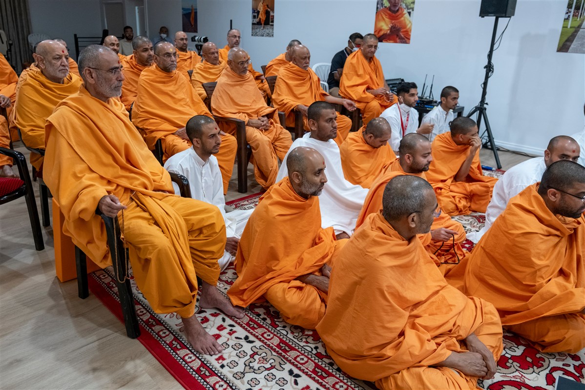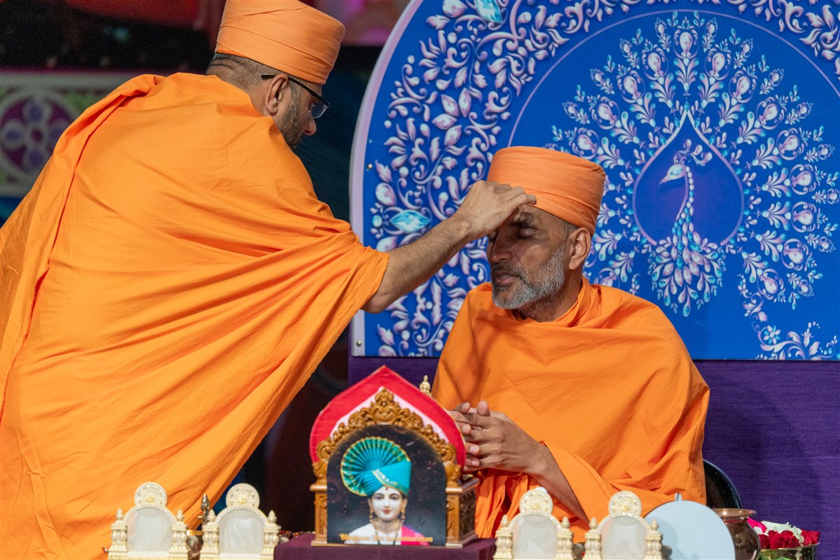 Pujya Ishwarcharan Swami and Anandswarup Swami honor Swamishri with a garland