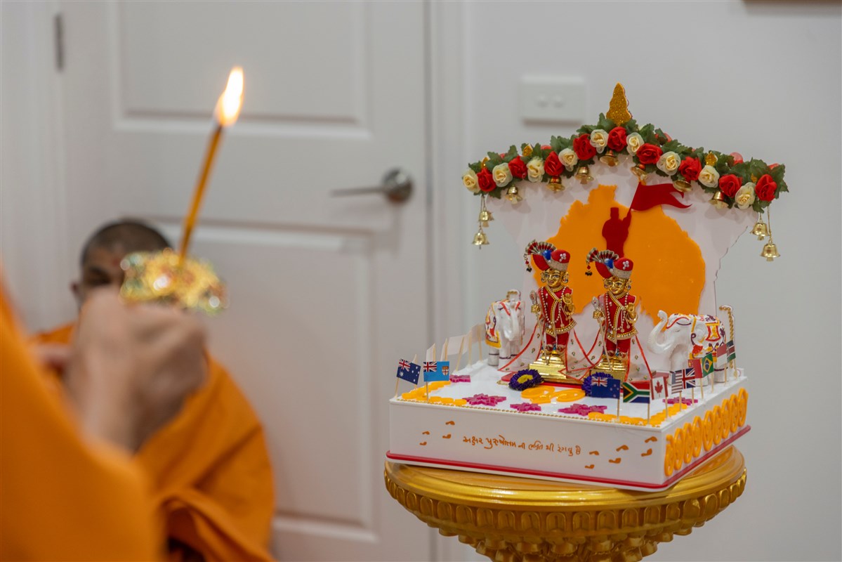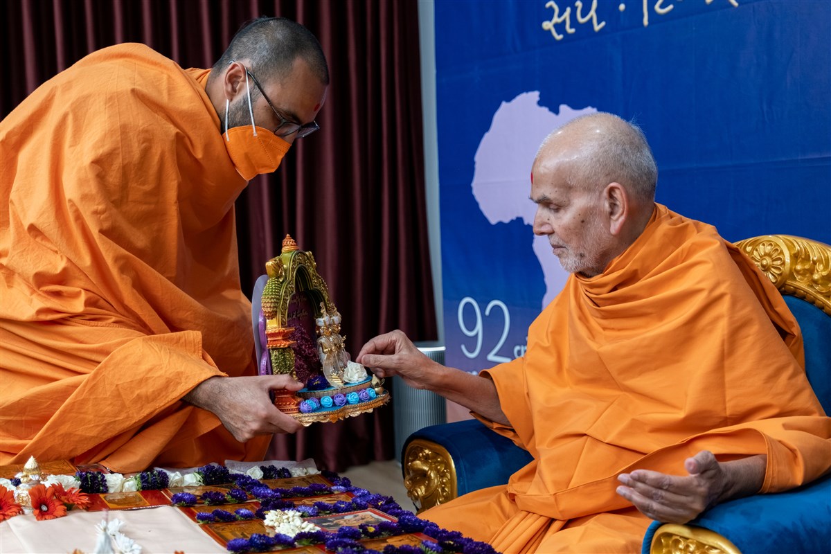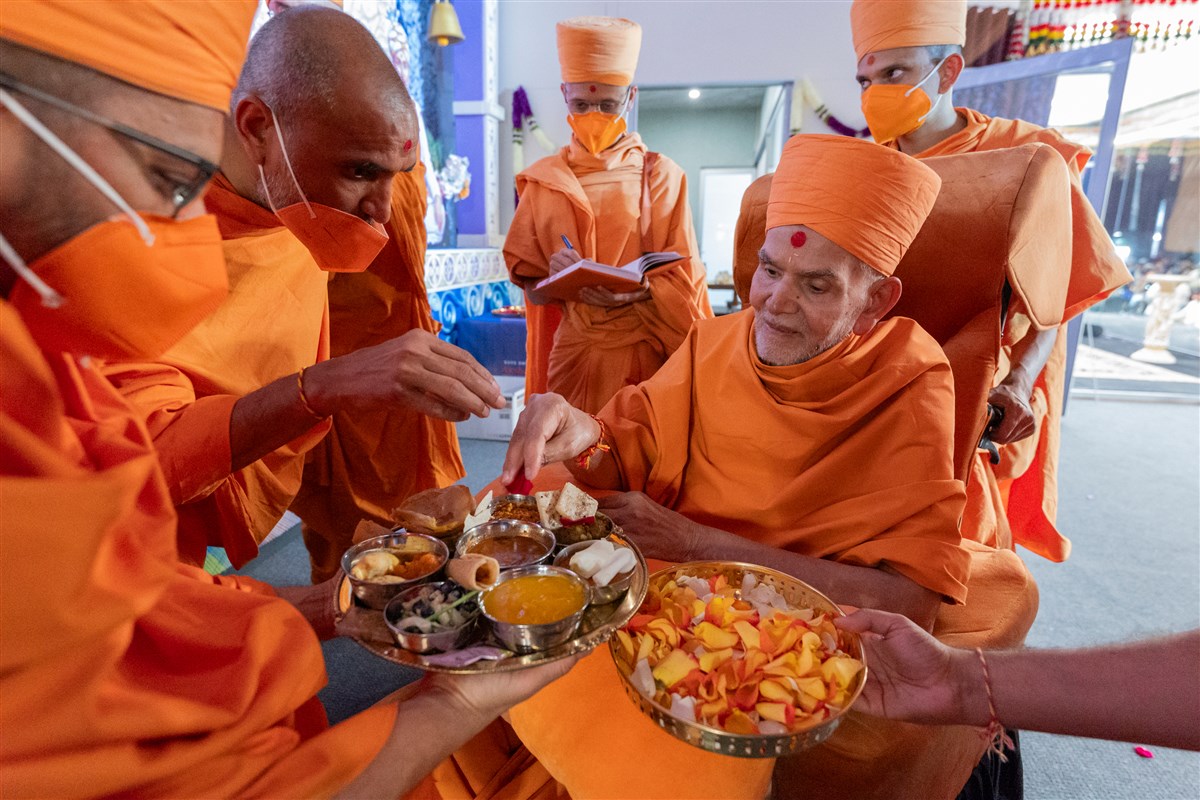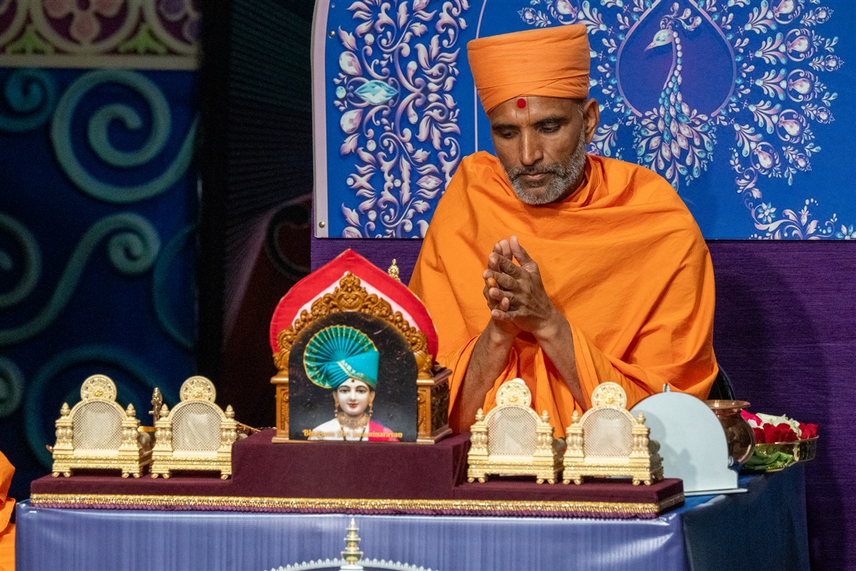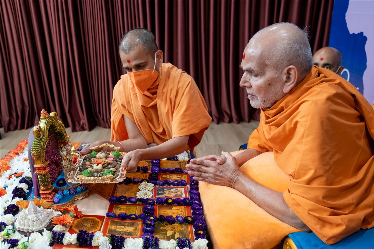 Pujya Ishwarcharan Swami offers thal to Shri Harikrishna Maharaj and Shri Gunatitanand Swami Maharaj