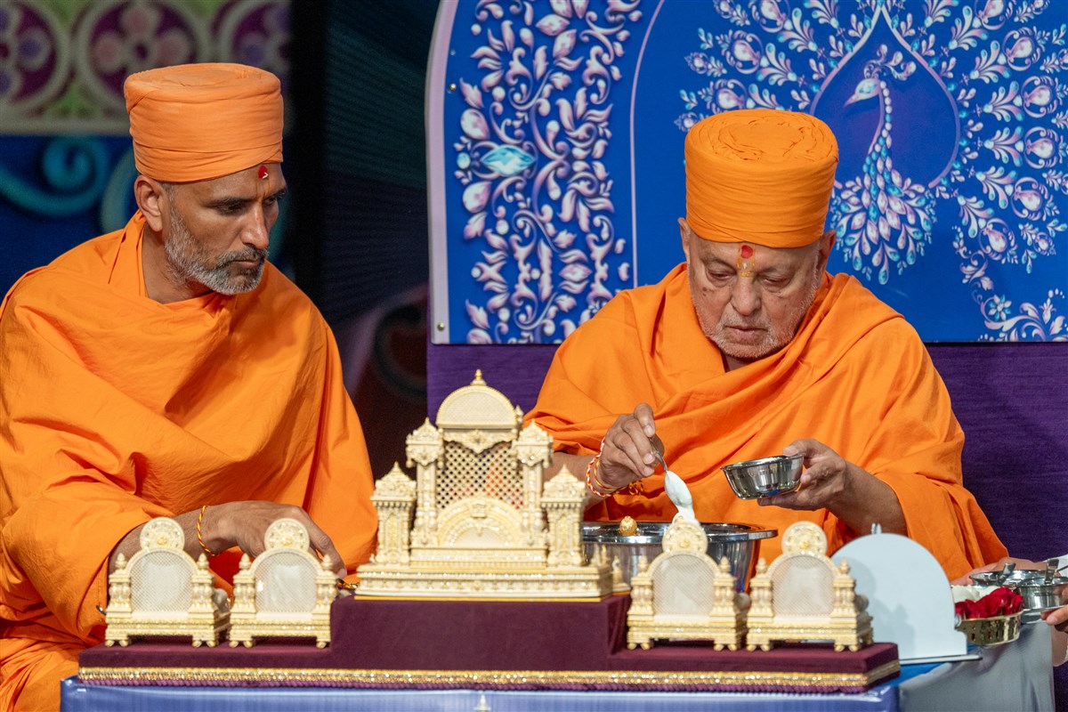 Swamishri offers thal to Shri Harikrishna Maharaj and Shri Gunatitanand Swami Maharaj