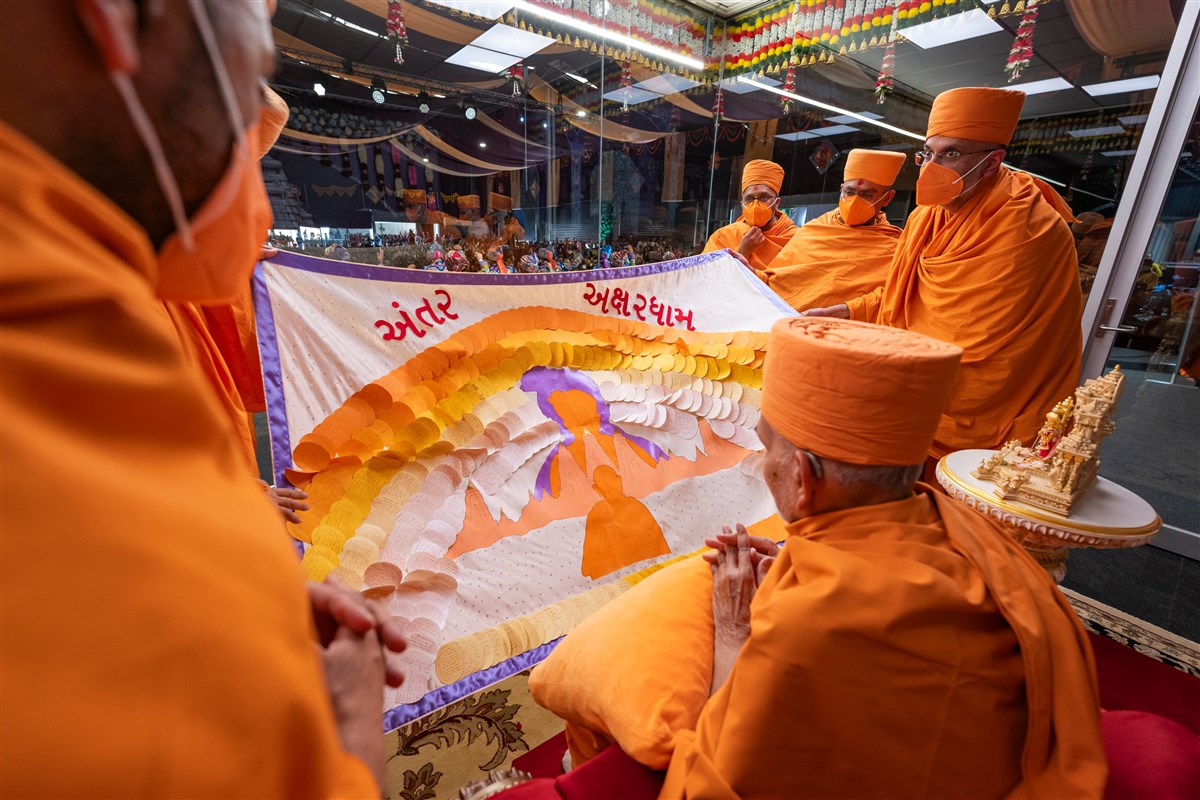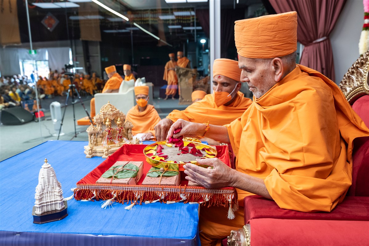 Swamishri showers flower petals on sand from the Akshardham grounds