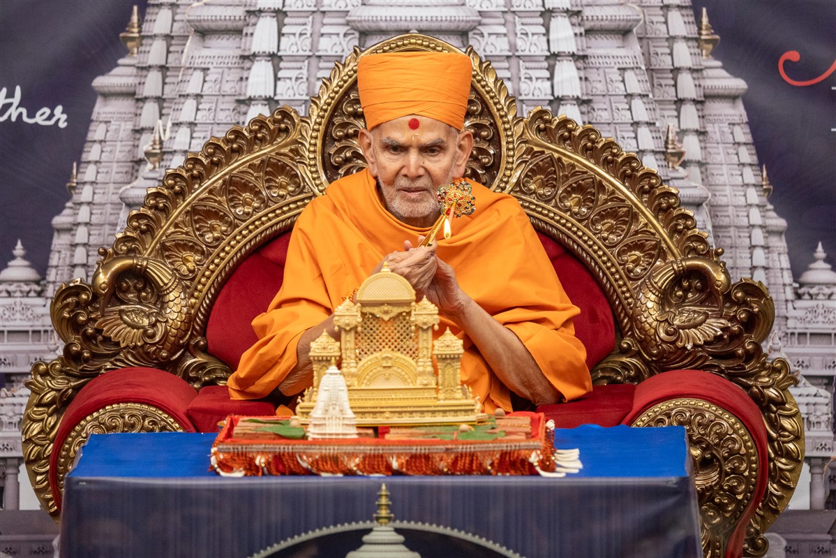 Swamishri lights a lamp for the Bhumi Pujan mahapuja