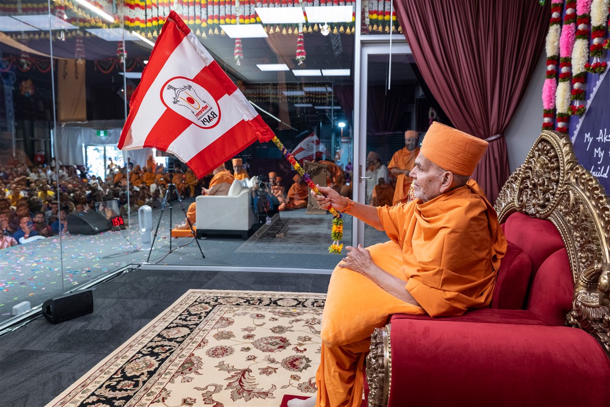 Swamishri offers a flower to Shri Harikrishna Maharaj and Shri Gunatitanand Swami Maharaj