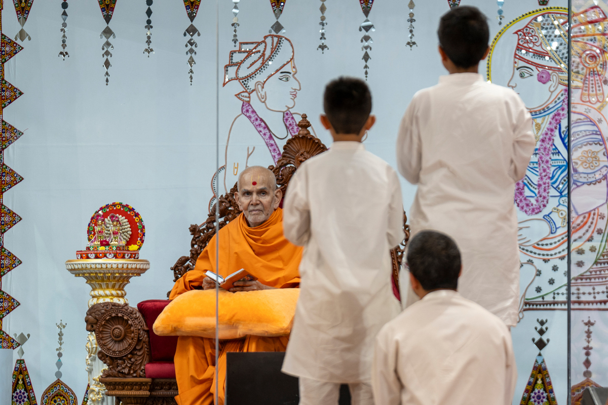Children lead everyone in reciting the sadhana mantra and daily prayer in Swamishri's puja