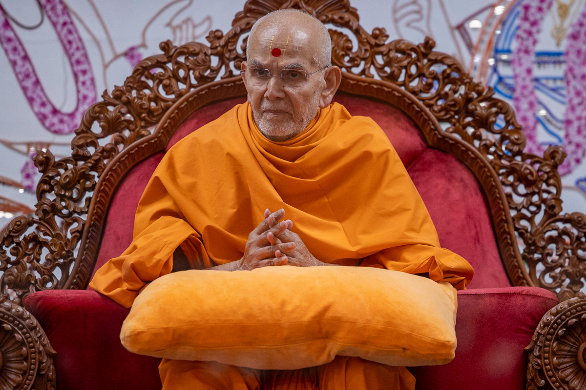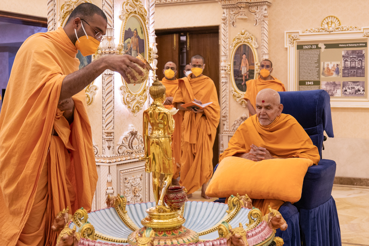 Param Pujya Mahant Swami Maharaj performs the morning arti
