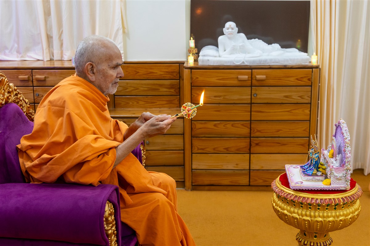 Swamishri offers thal to Shri Harikrishna Maharaj and Shri Gunatitanand Swami Maharaj