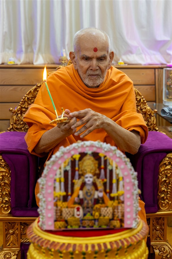 Swamishri offers rice grains to Shri Harikrishna Maharaj and Shri Gunatitanand Swami Maharaj during recitation of the Sahajanand Namavali
