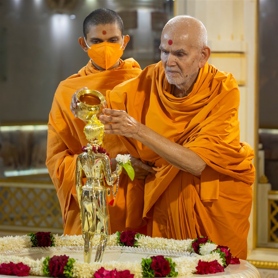 Swamishri adds flowers to the sanctified water