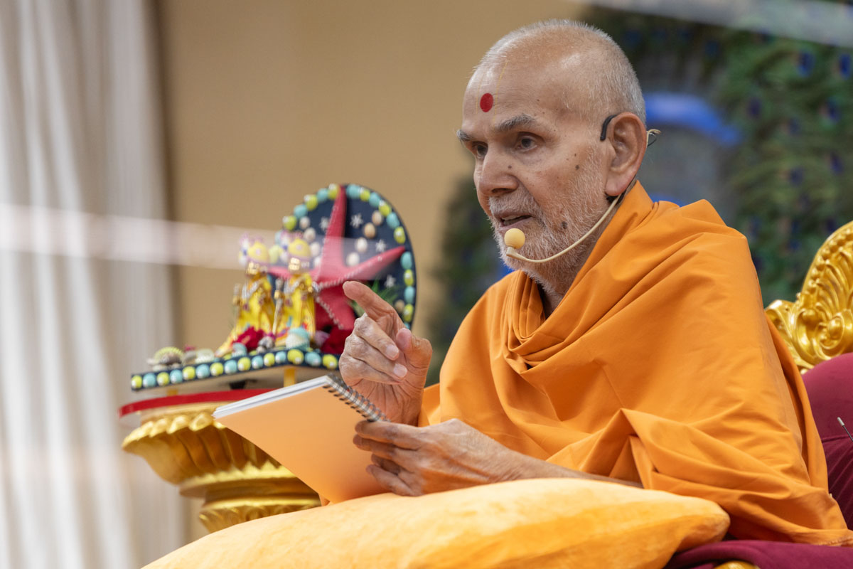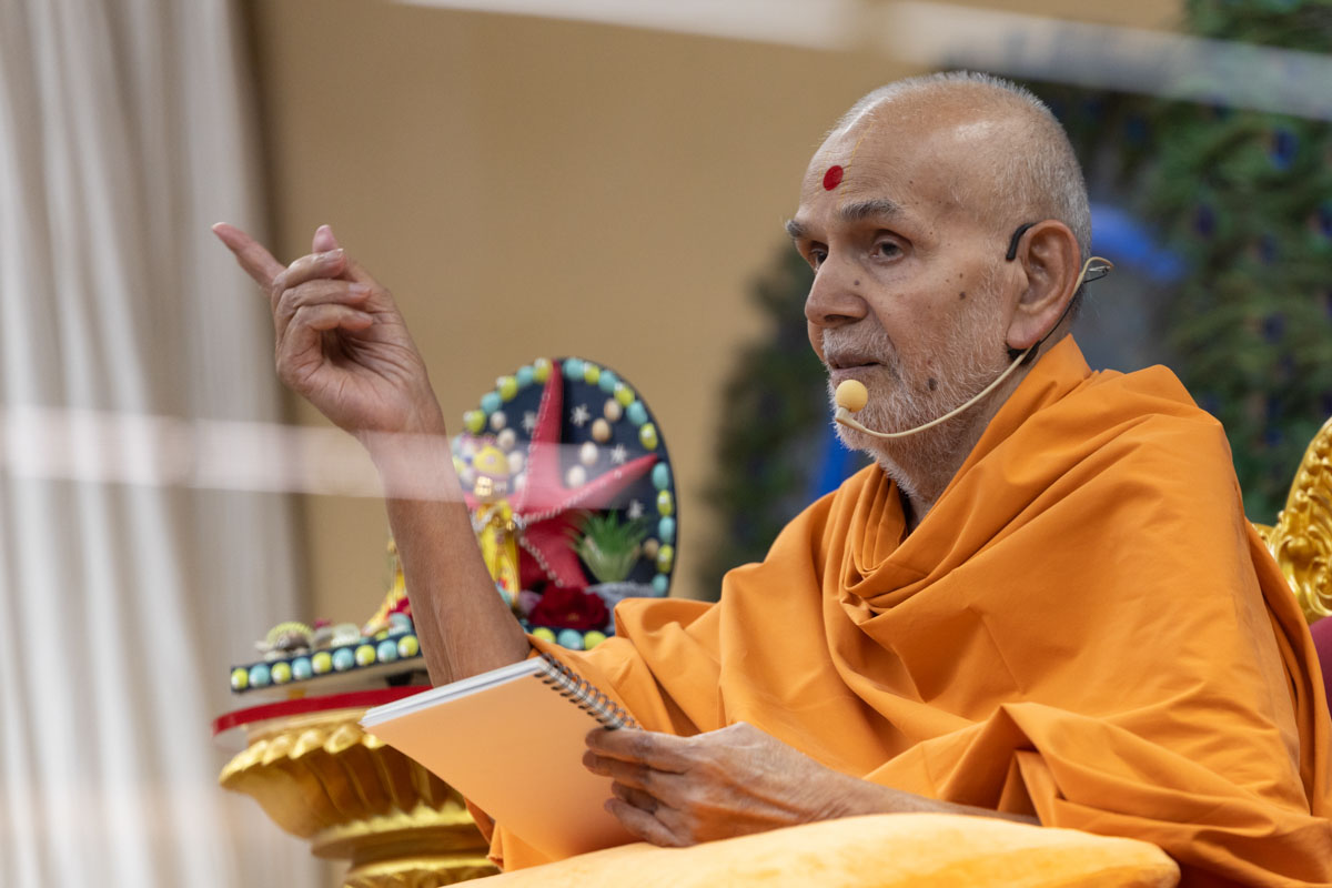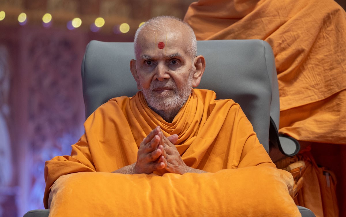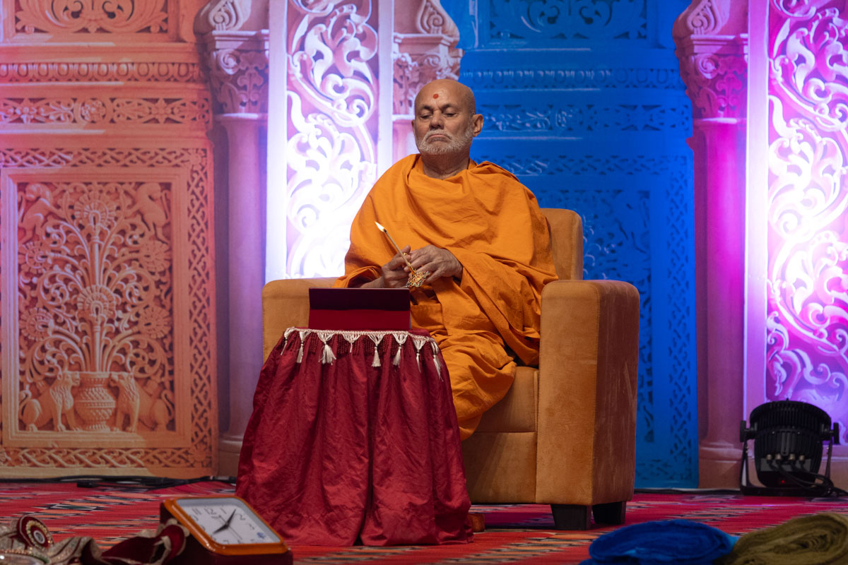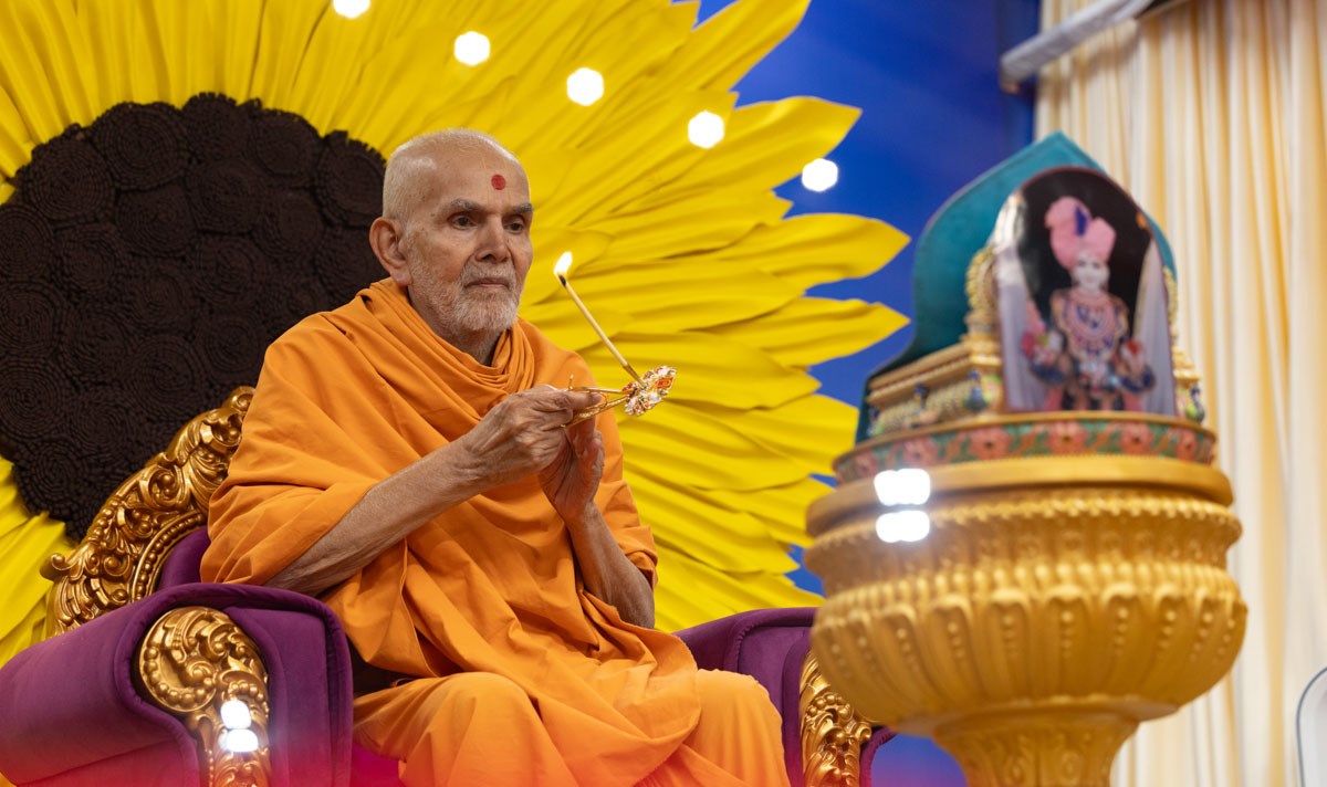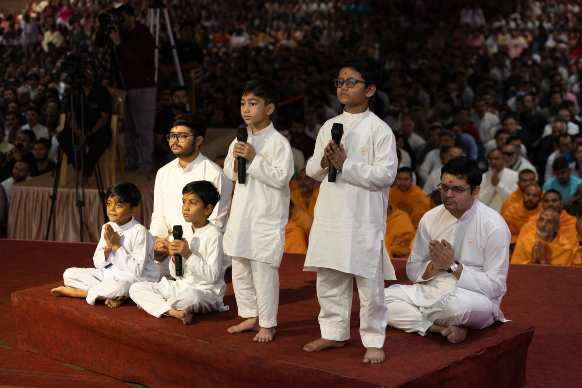Balaks lead everyone in reciting the sadhana mantra and daily prayer in Swamishri's puja