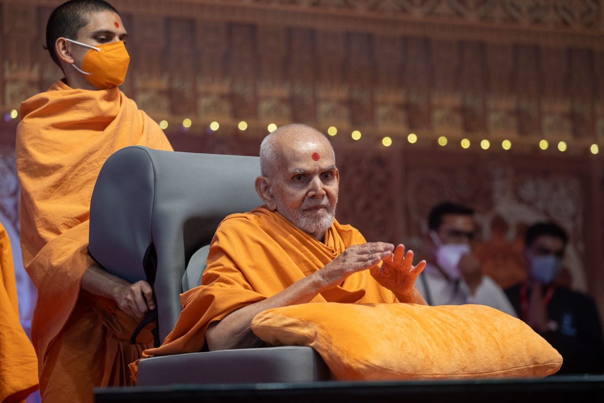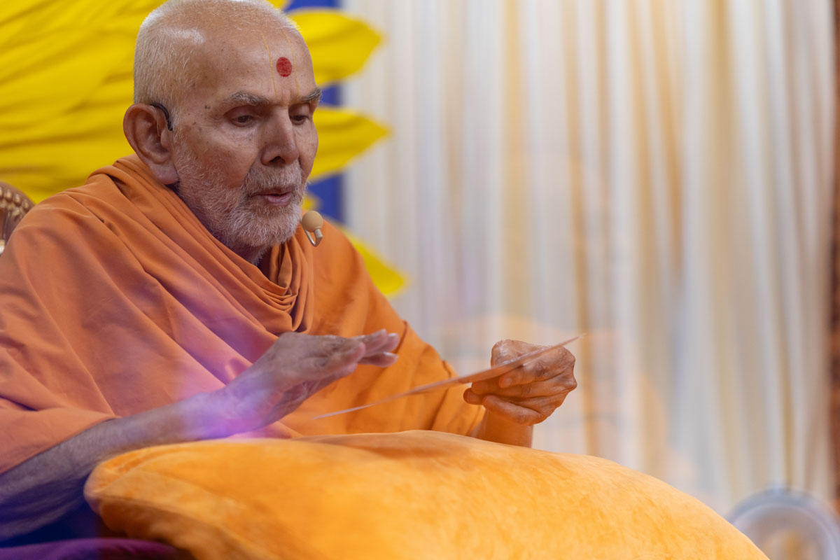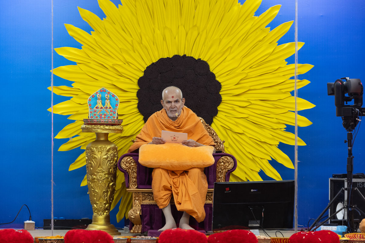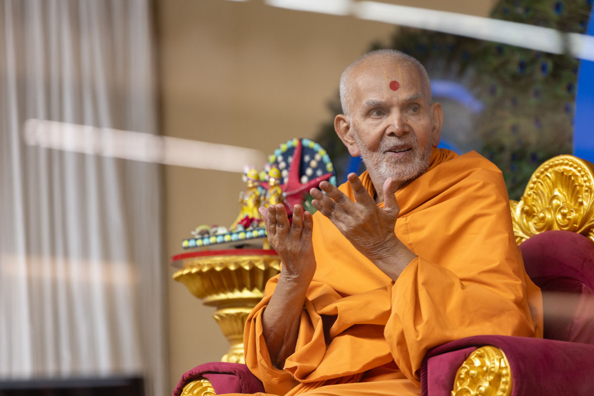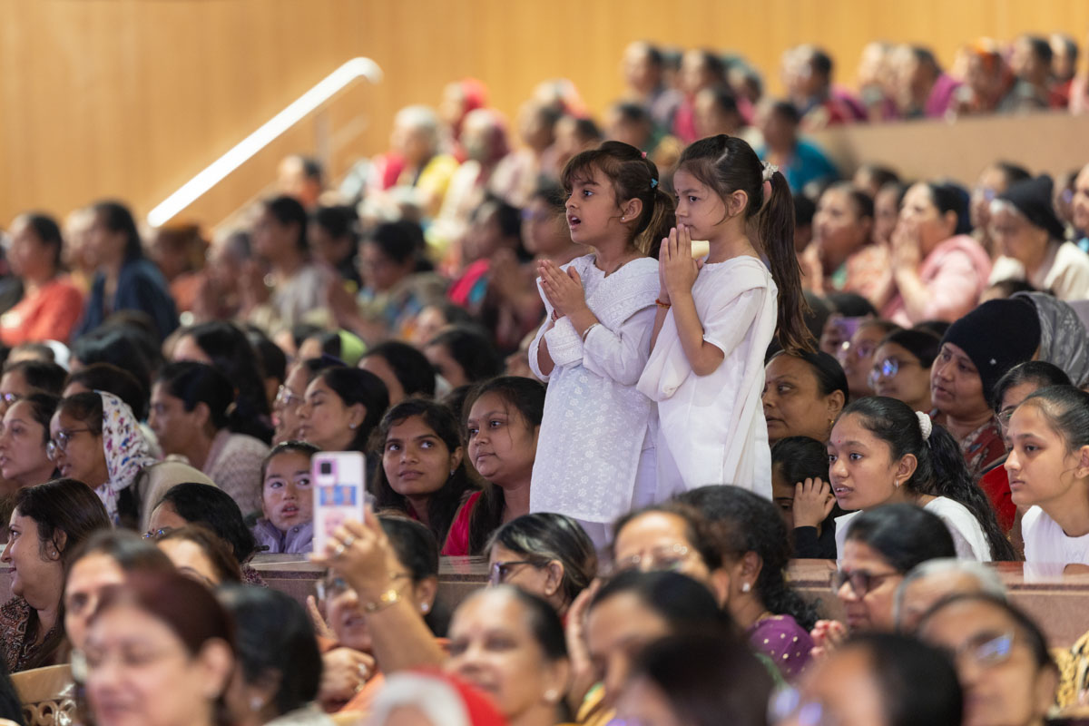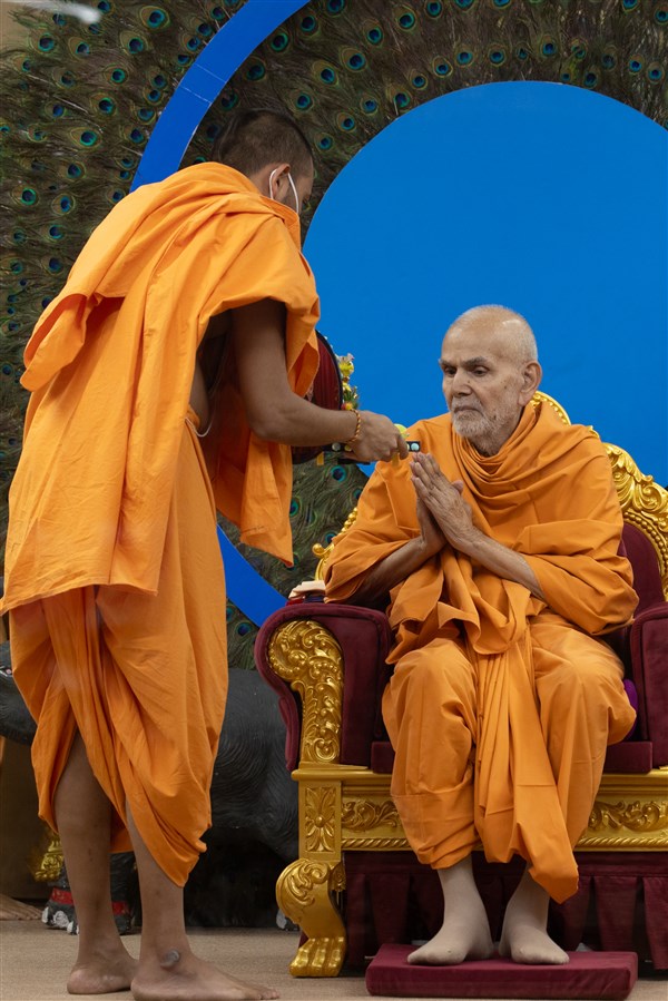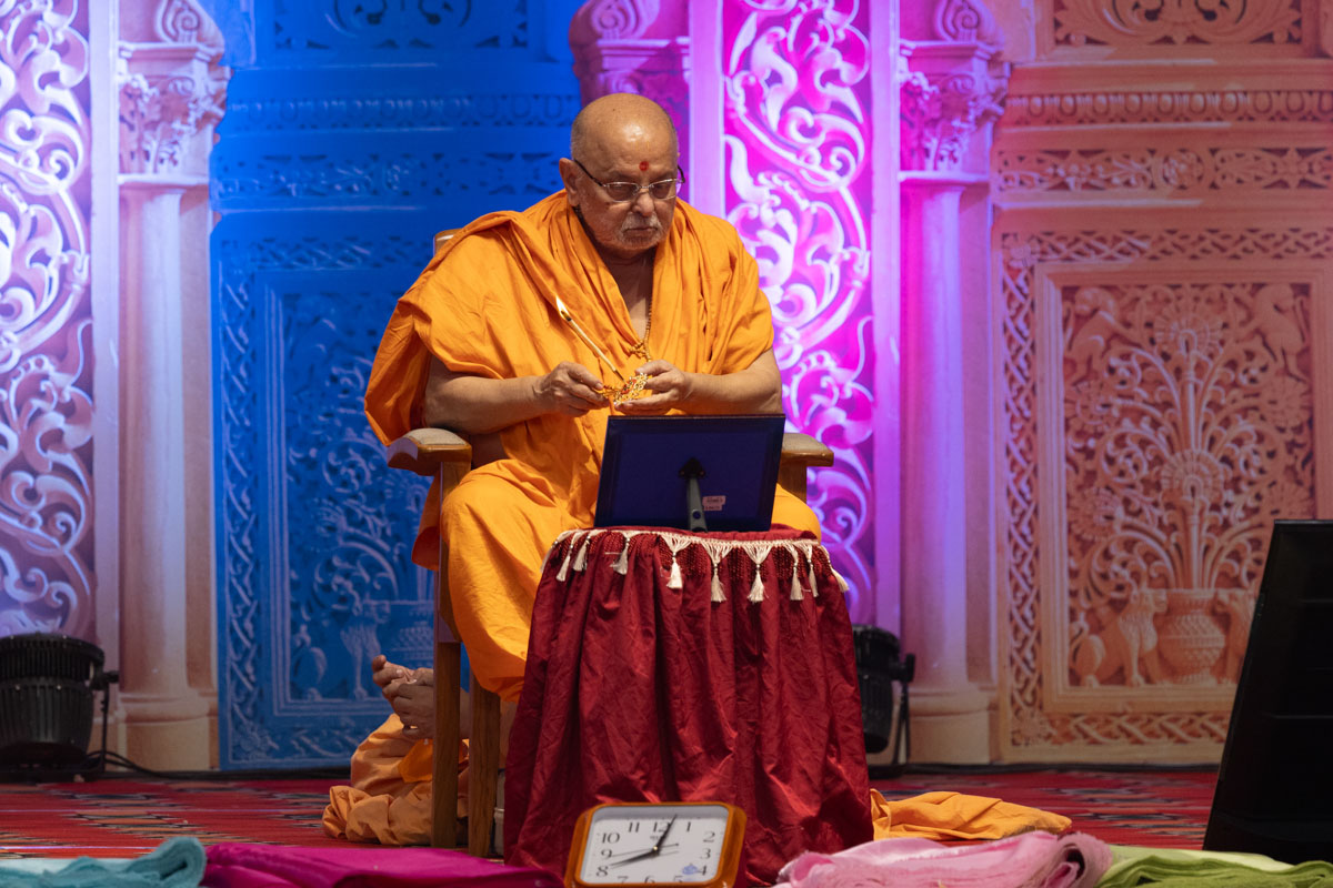 Balaks lead everyone in reciting the sadhana mantra and daily prayer in Swamishri's puja
