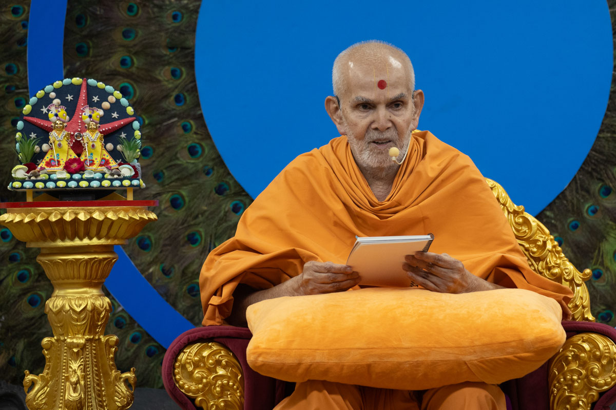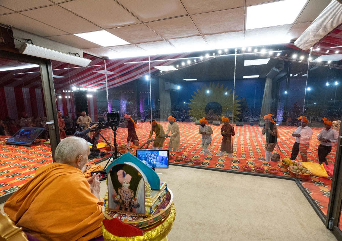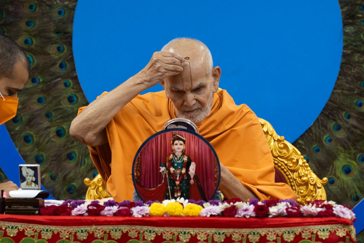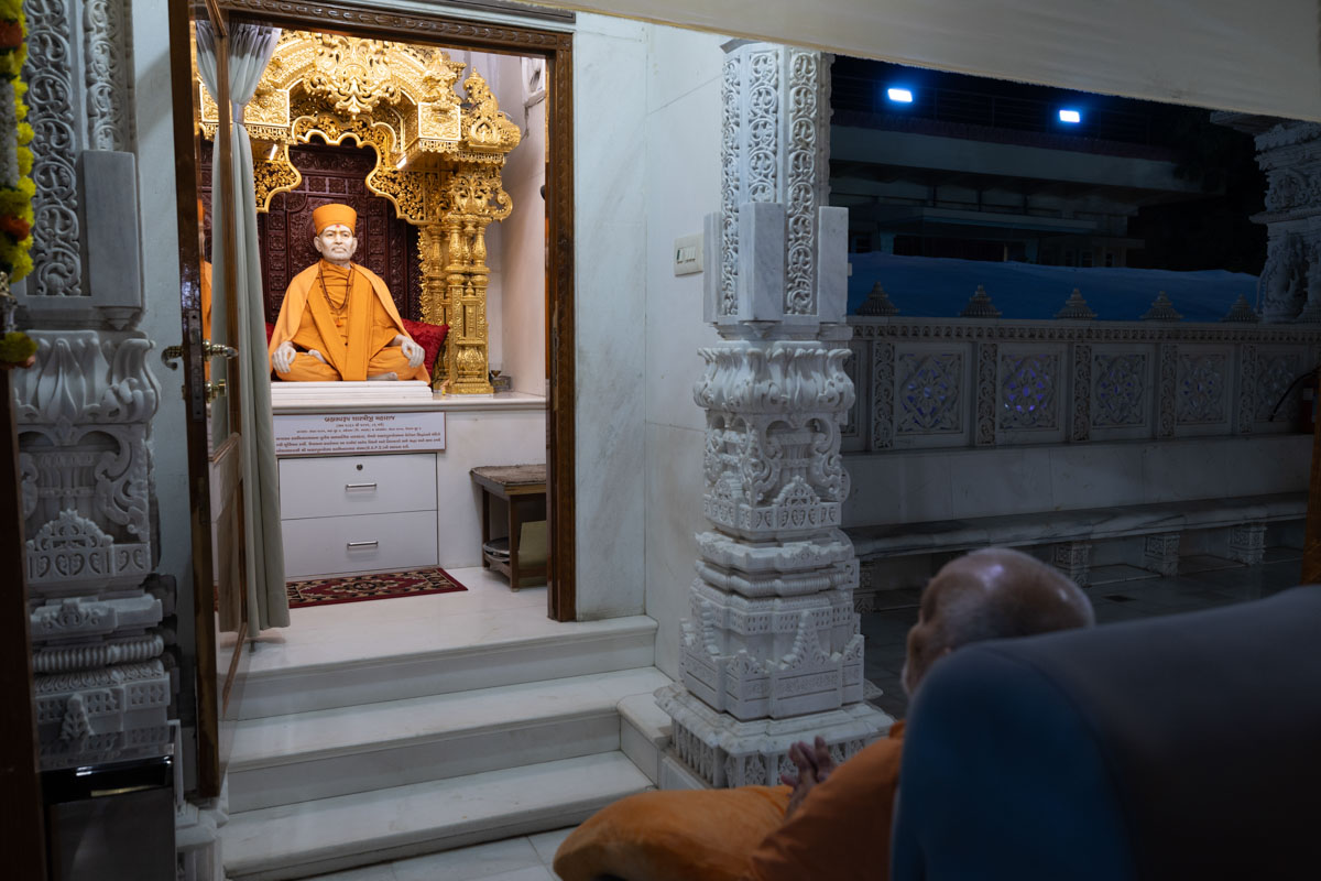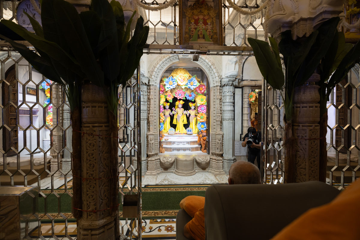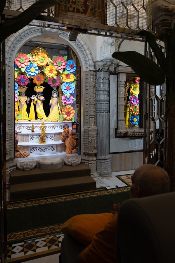 Swamishri engrossed in darshan of Shri Harikrishna Maharaj, Bhagwan Shri Krishna and Shri Radhaji