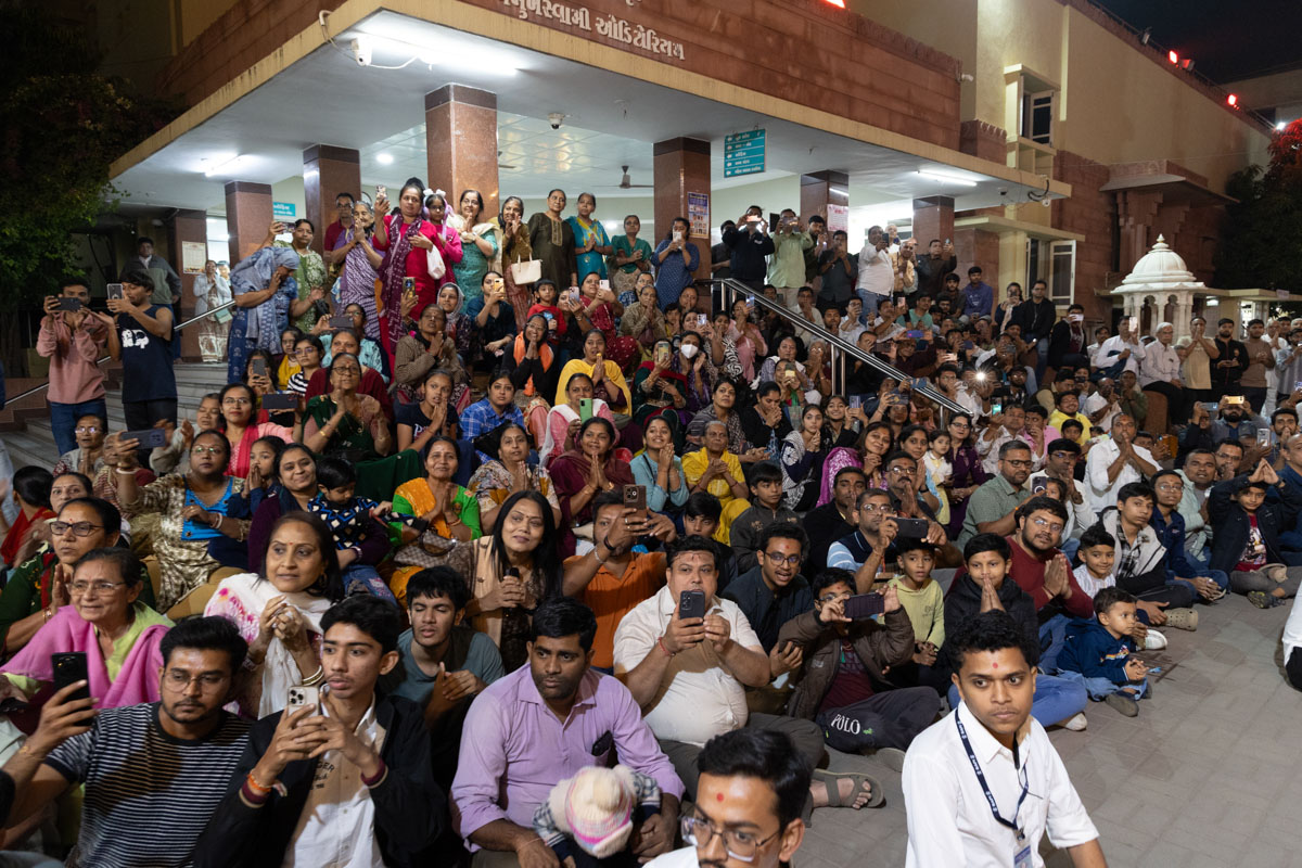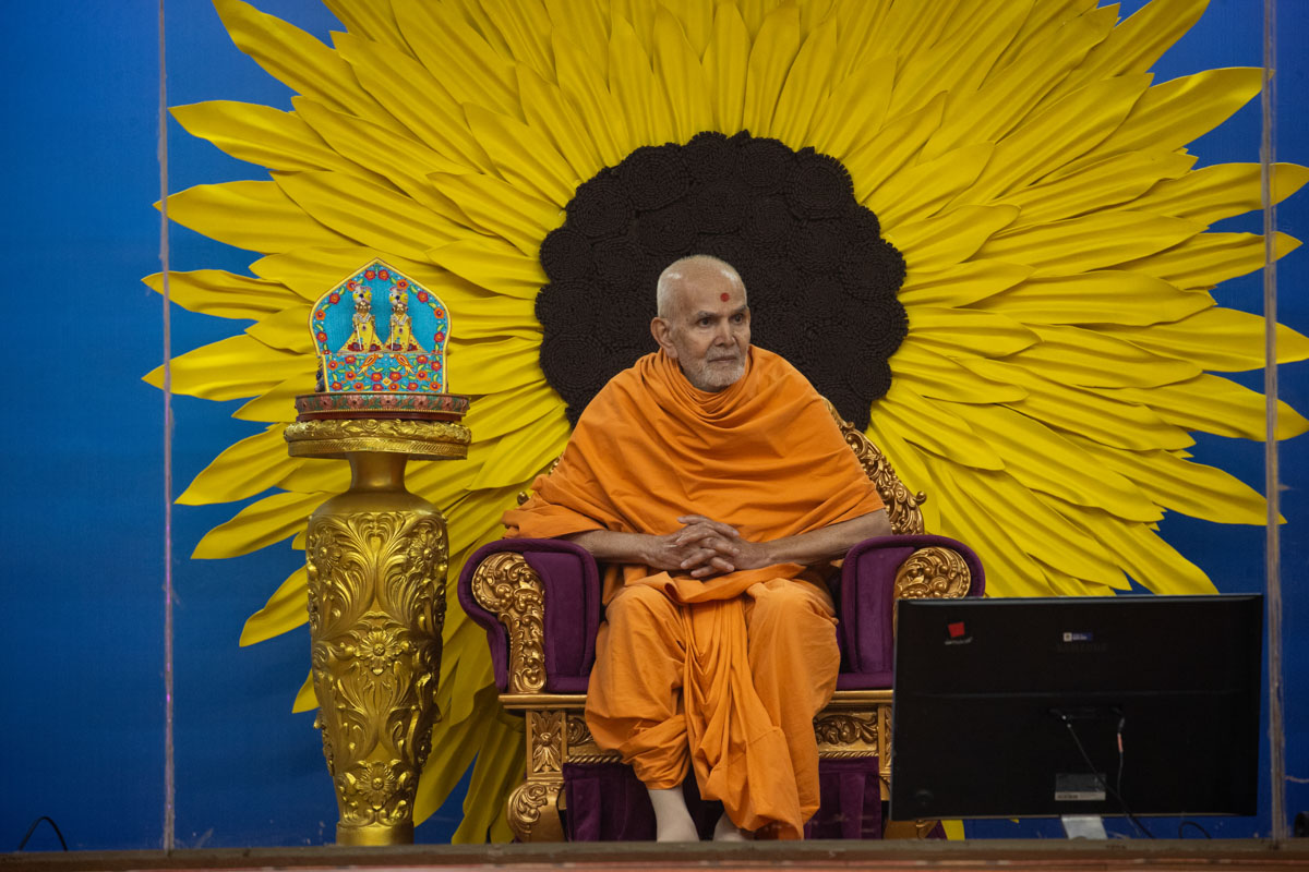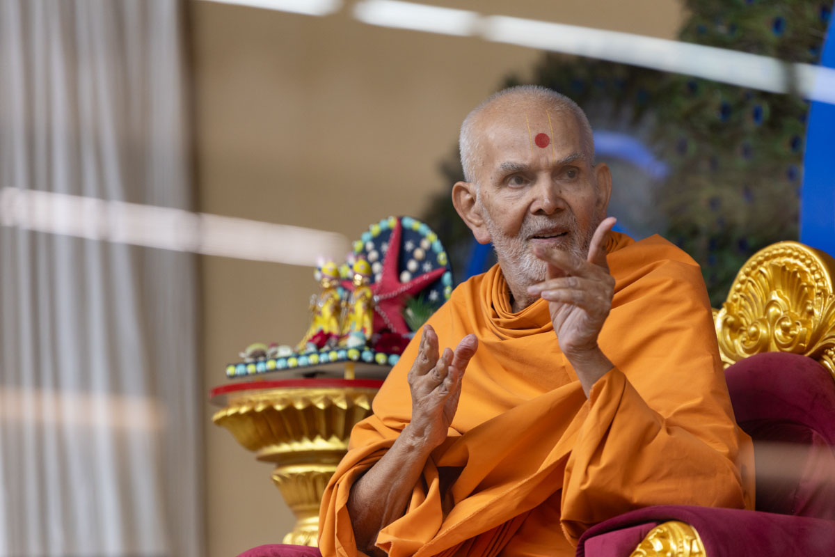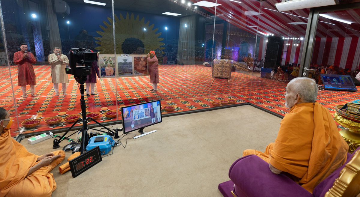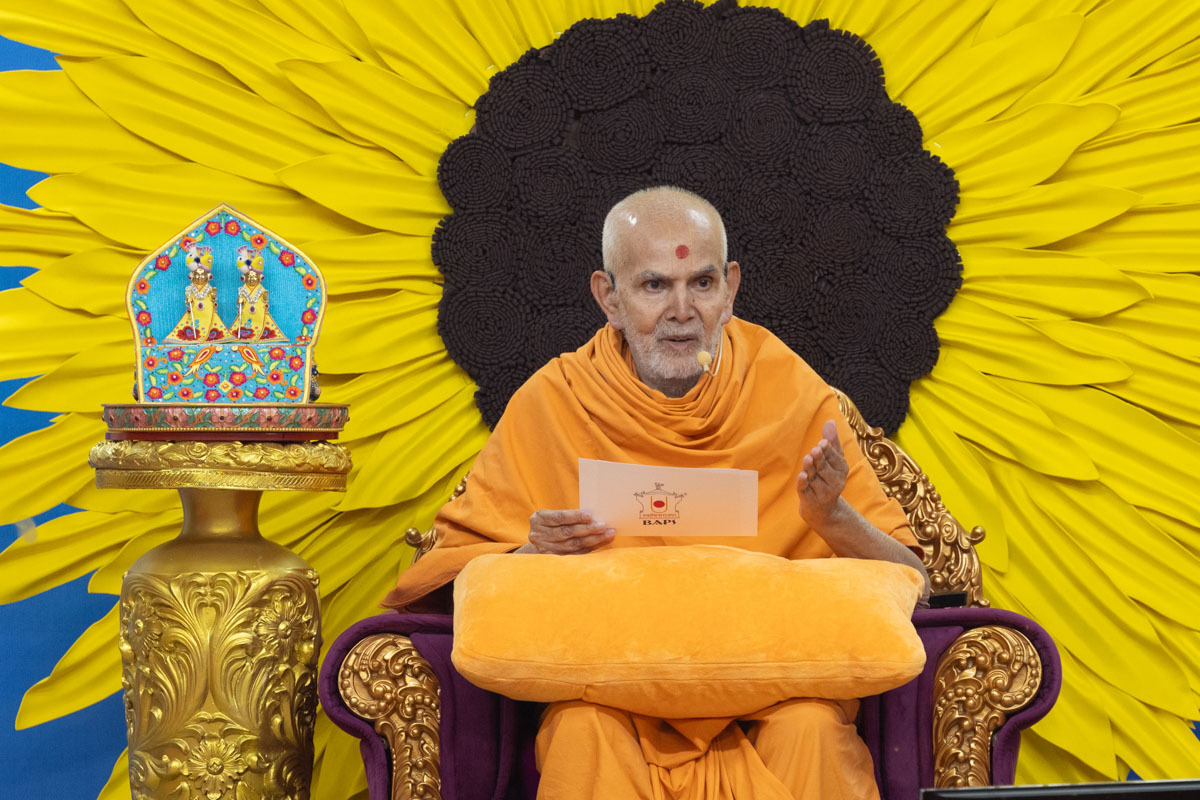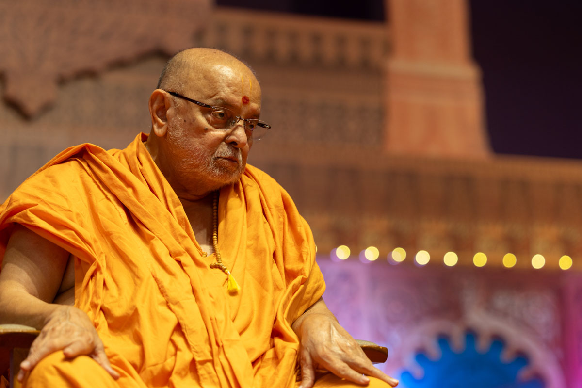 Swamishri engrossed in darshan of Shri Harikrishna Maharaj, Bhagwan Shri Krishna and Shri Radhaji