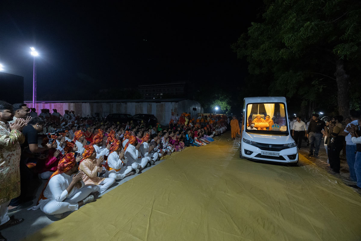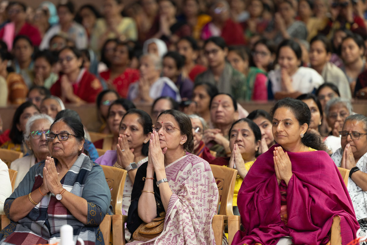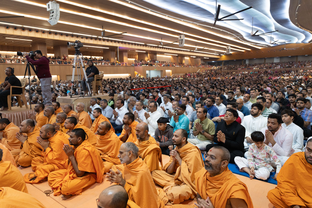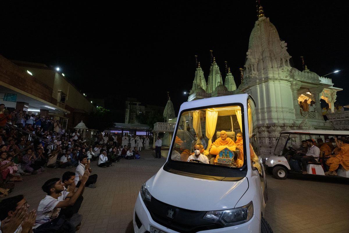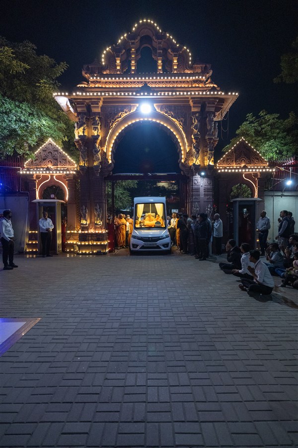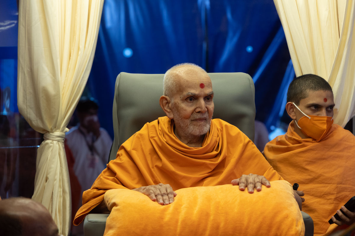 Swamishri engrossed in darshan of Shri Harikrishna Maharaj, Bhagwan Shri Krishna and Shri Radhaji
