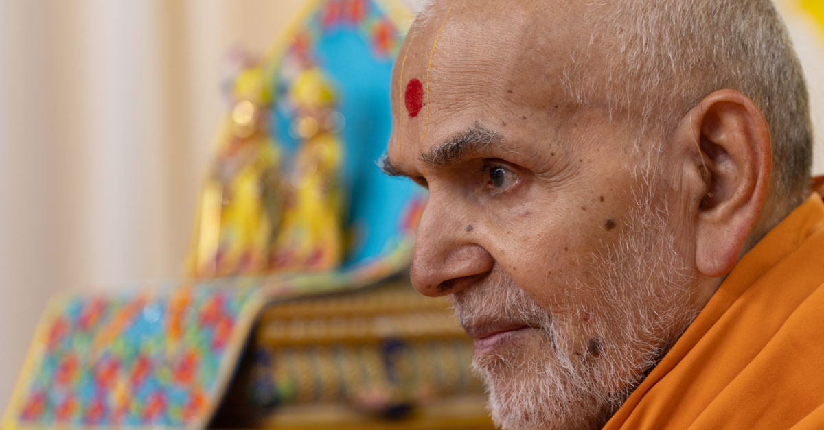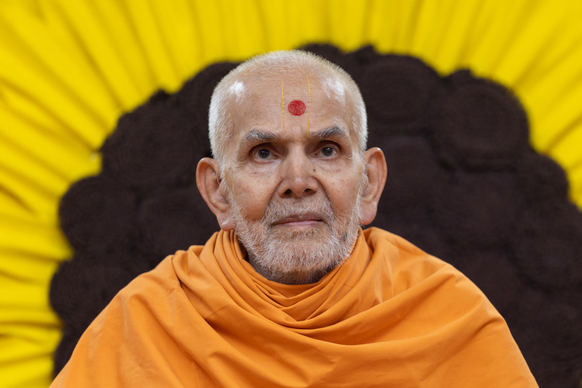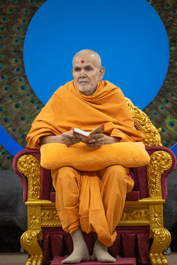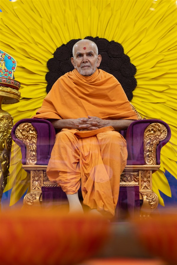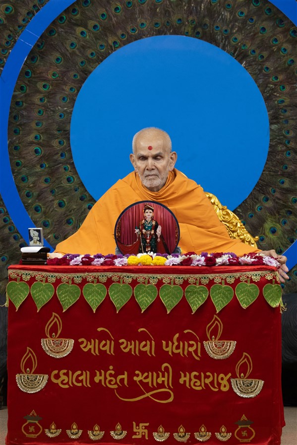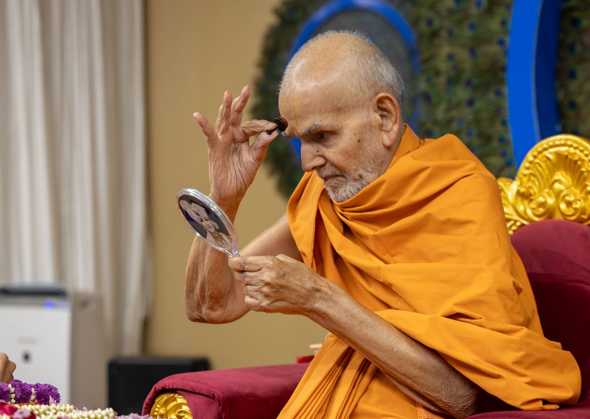 Param Pujya Mahant Swami Maharaj engrossed in darshan of Shri Harikrishna Maharaj and Shri Gunatitanand Swami Maharaj