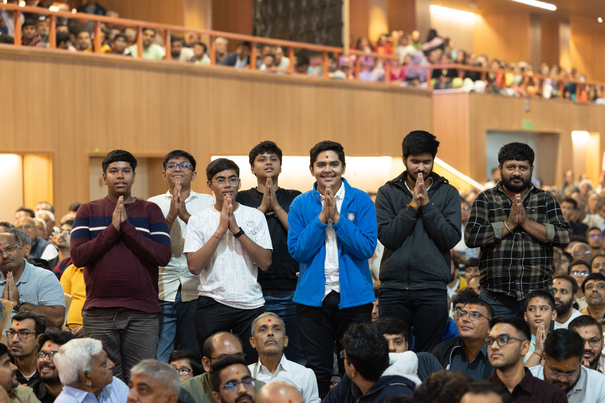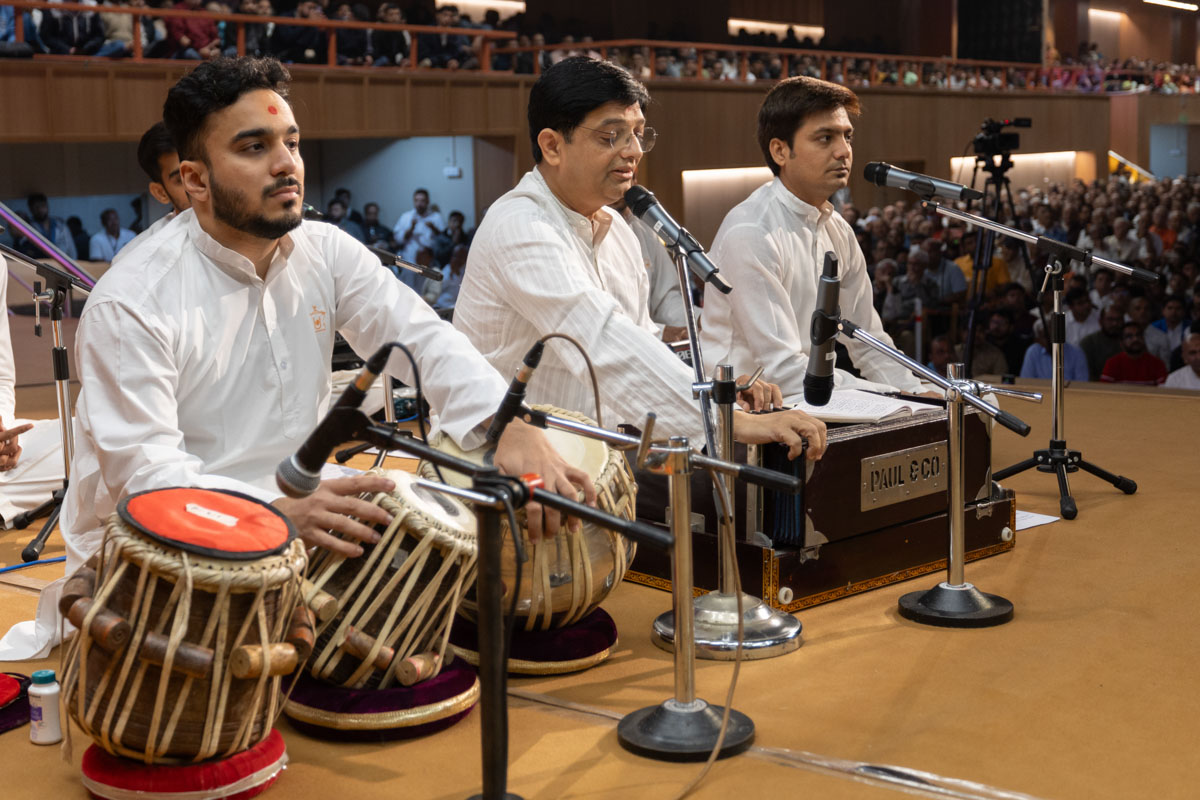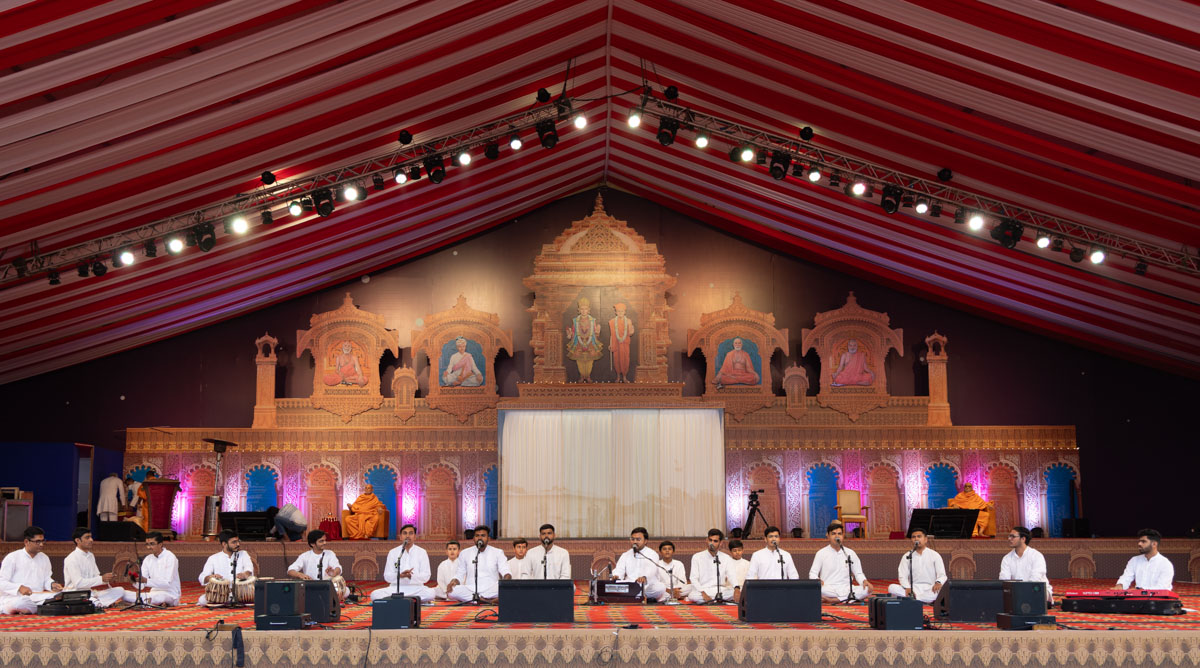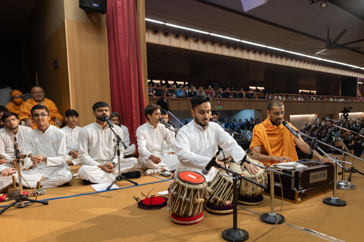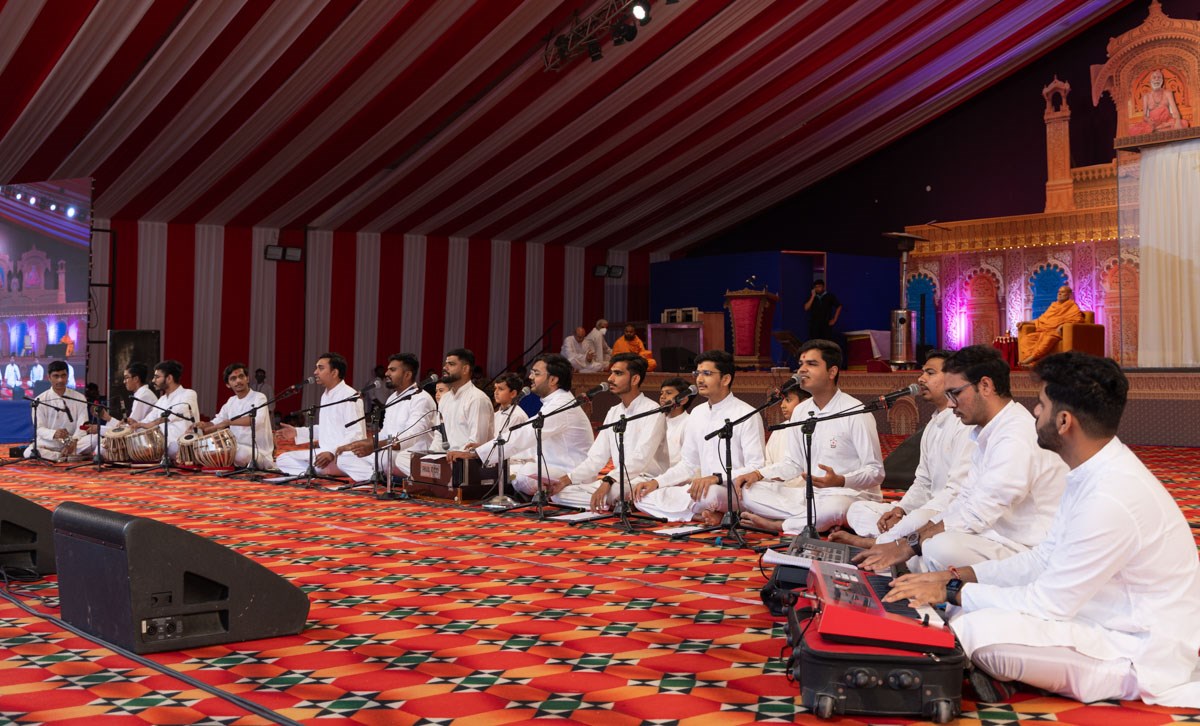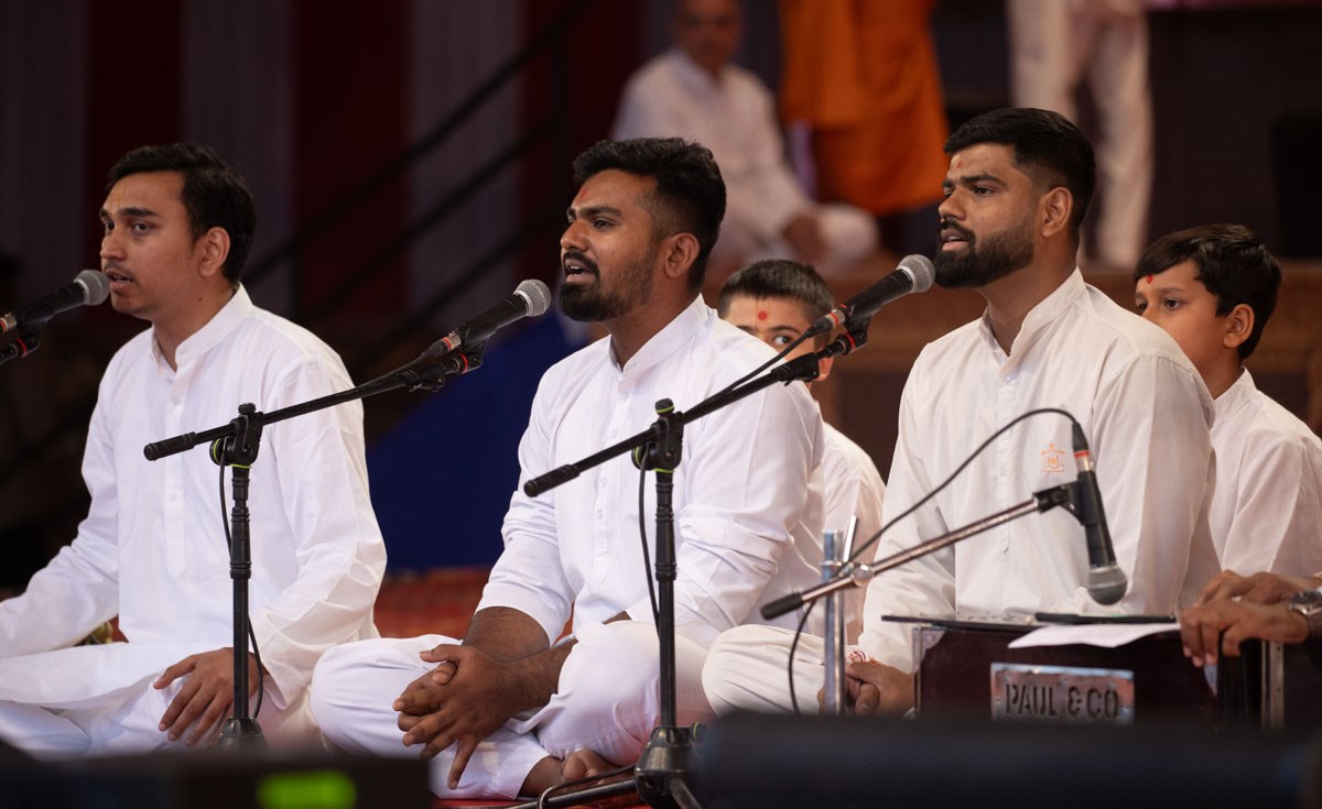 Yuvaks sing kirtans at the beginning of the evening assembly
