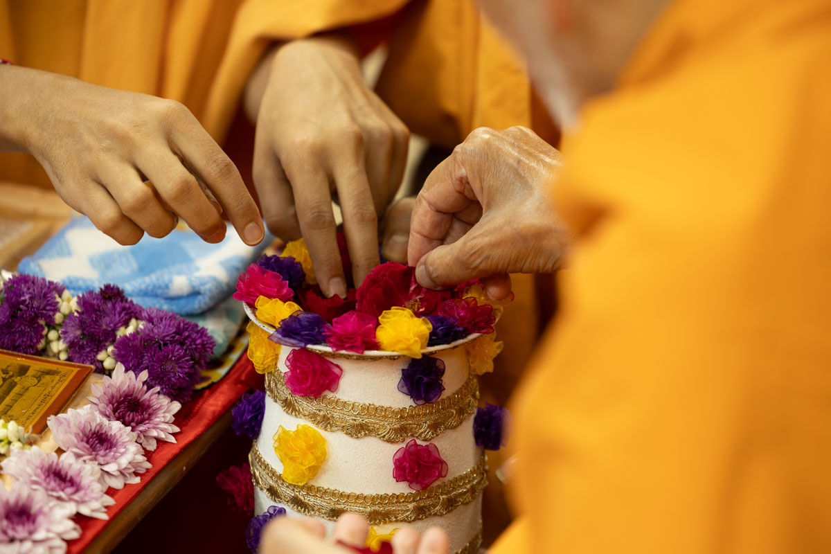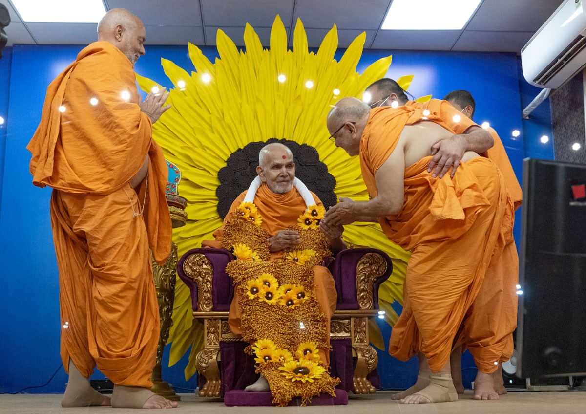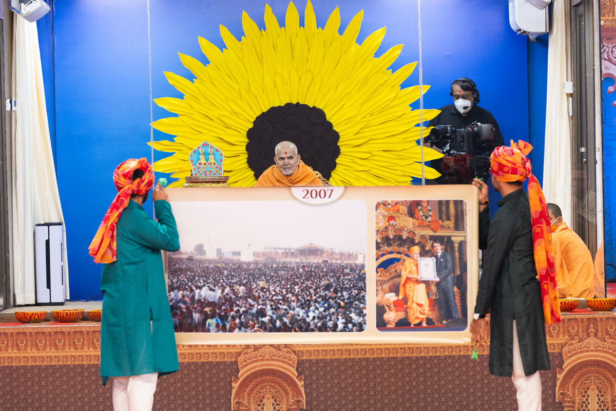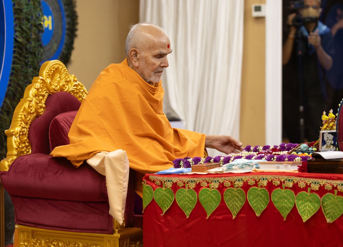 Swamishri places a flower at the feet of Shri Harikrishna Maharaj and Shri Gunatitanand Swami Maharaj