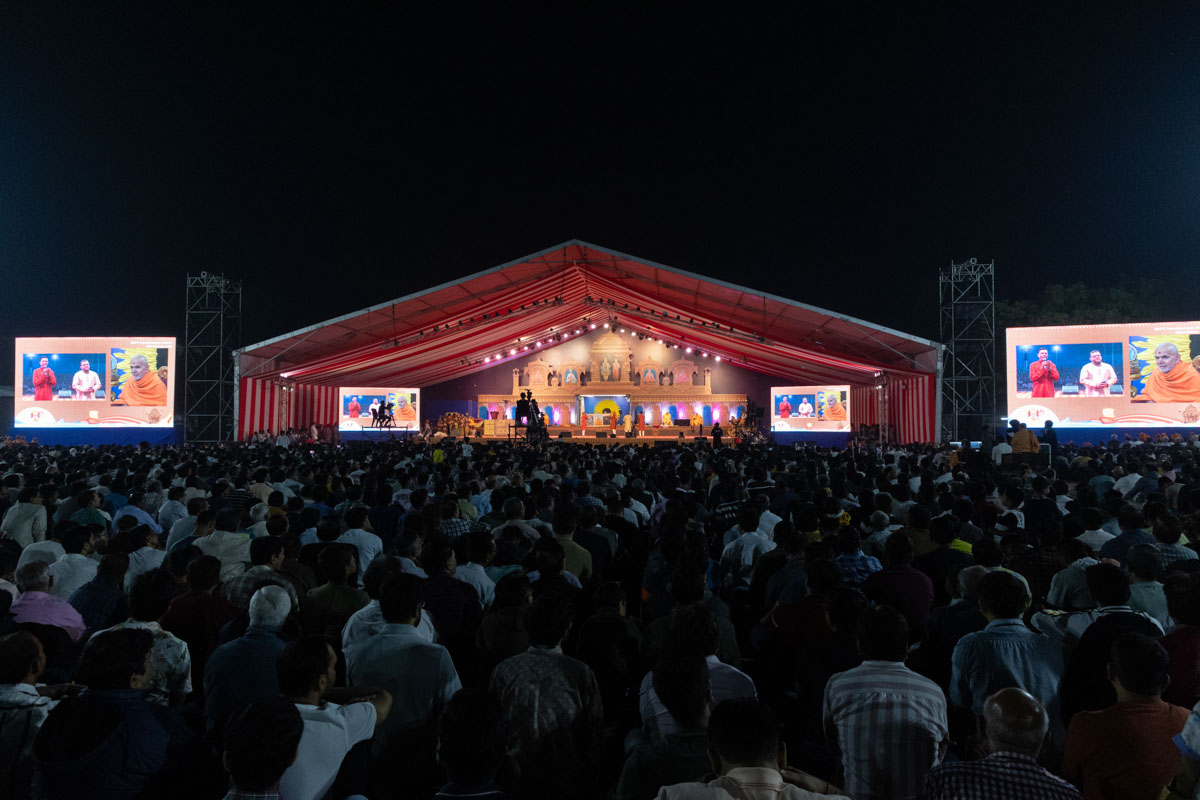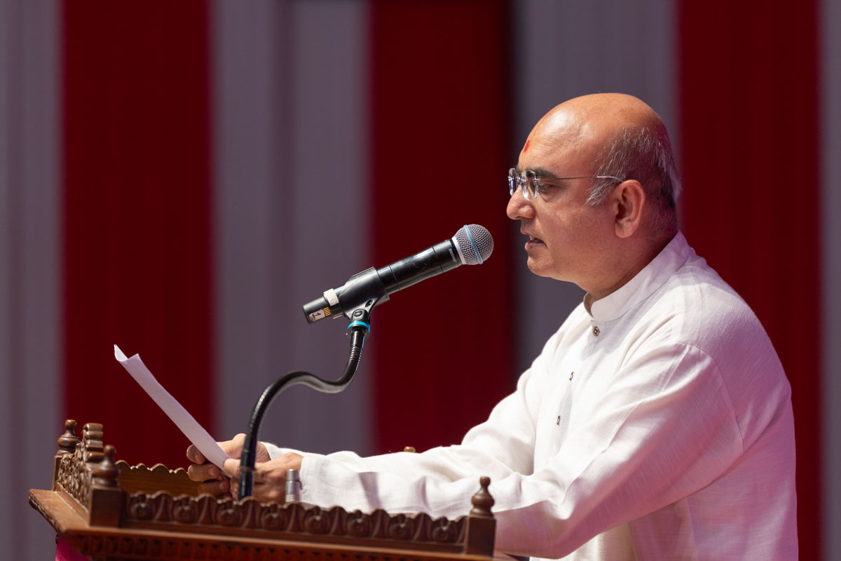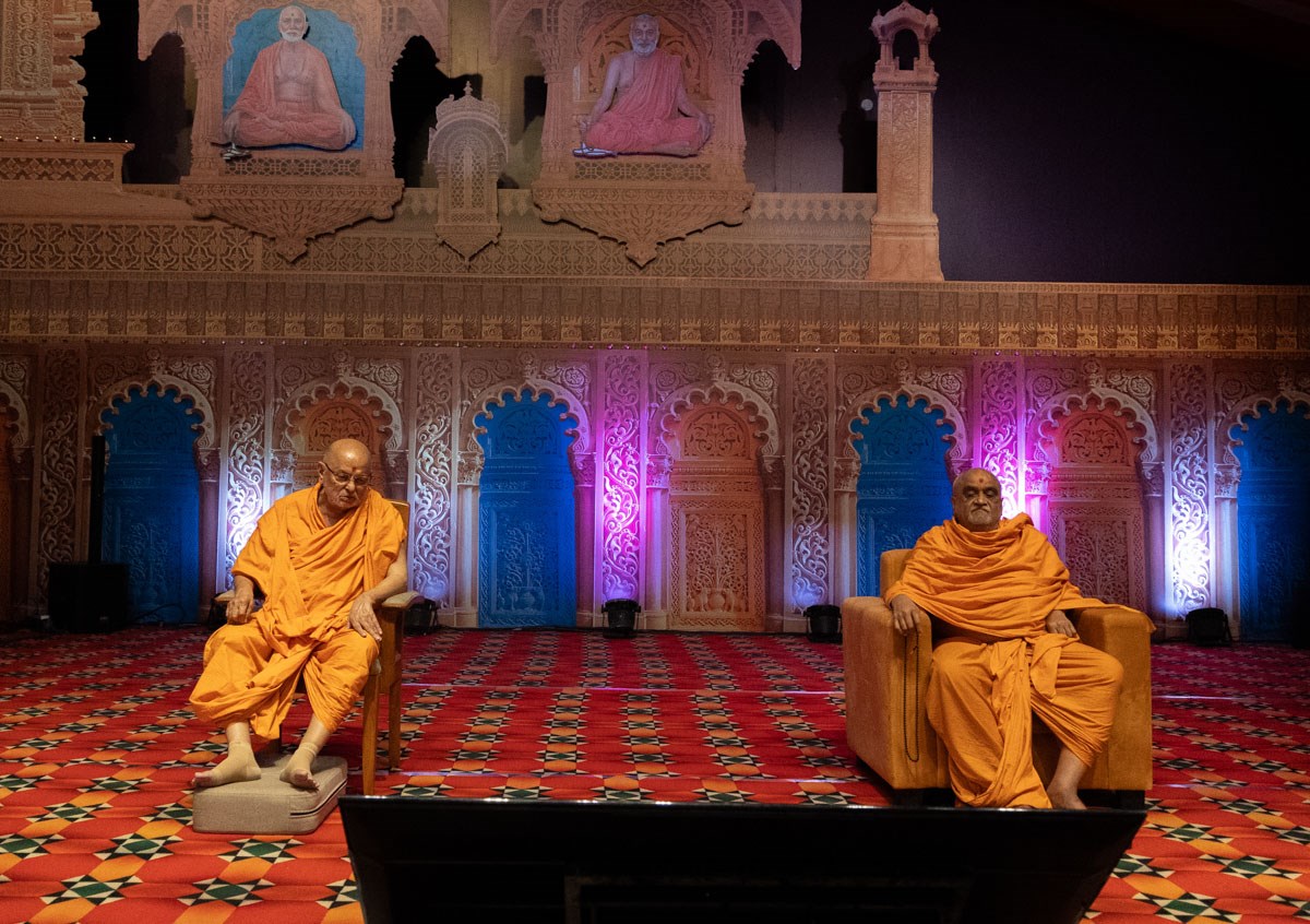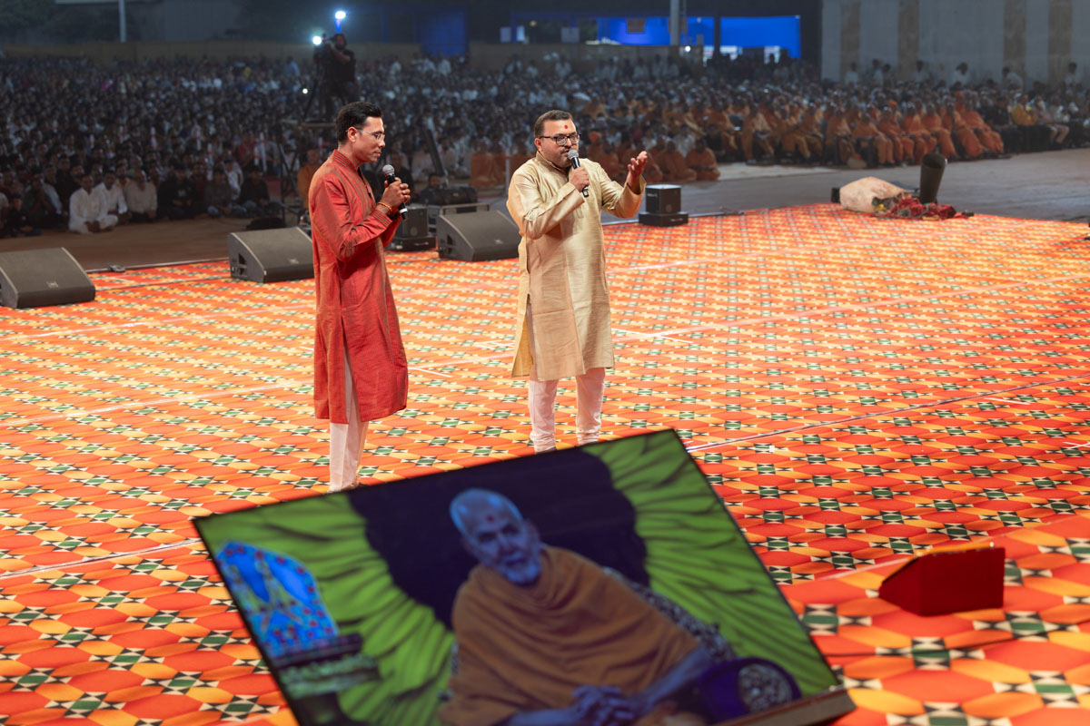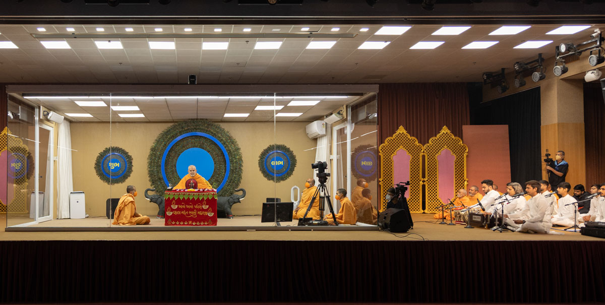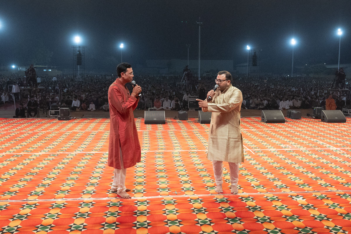 Pujya Ishwarcharan Swami and Shrihari Swami on the stage during the assembly
