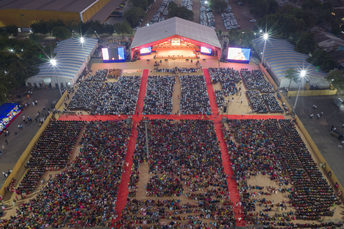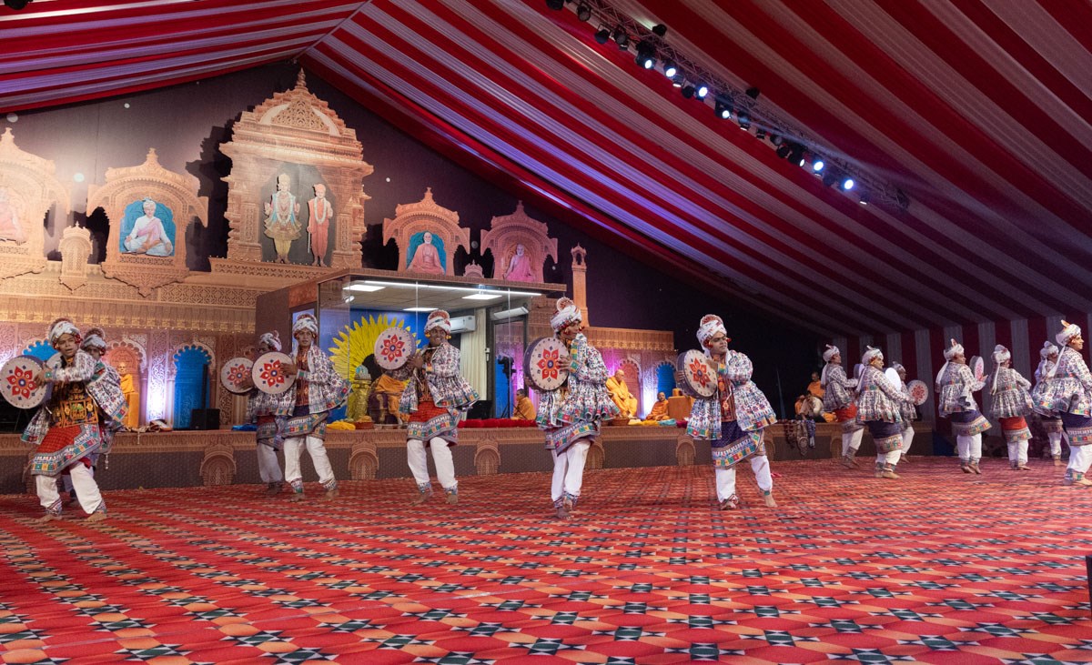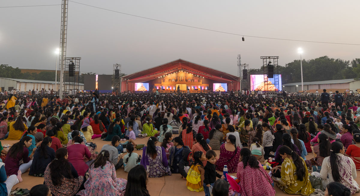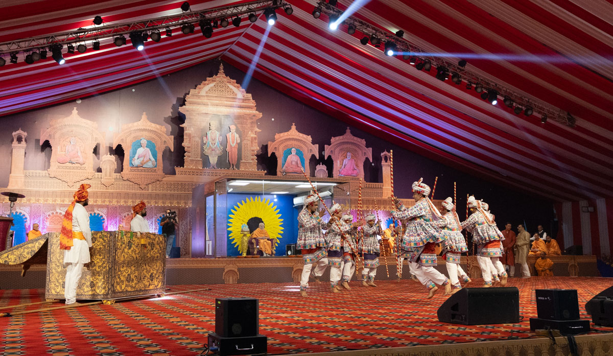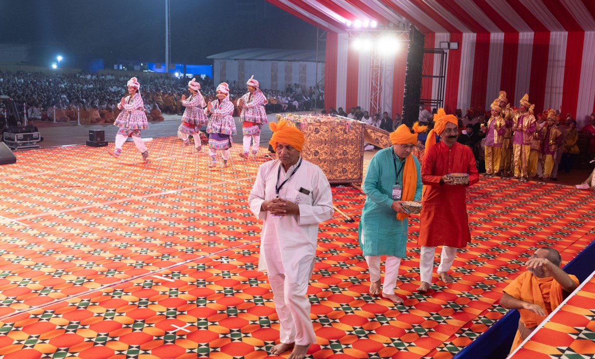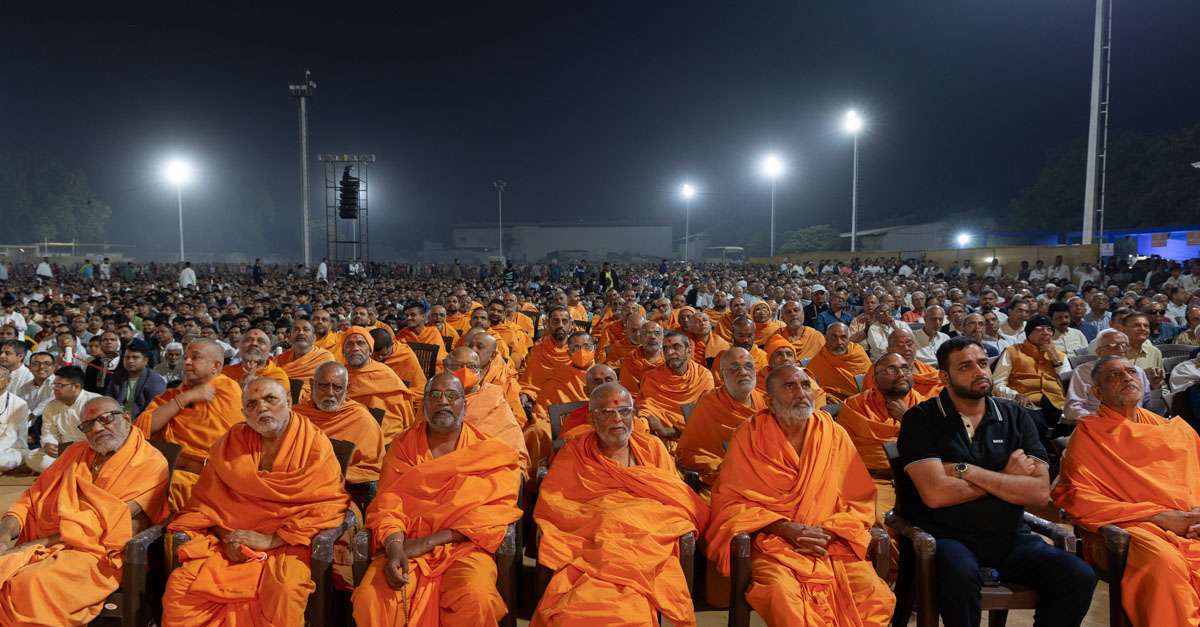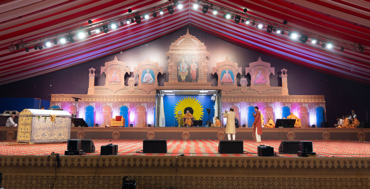 Pujya Ishwarcharan Swami and Shrihari Swami on the stage during the assembly