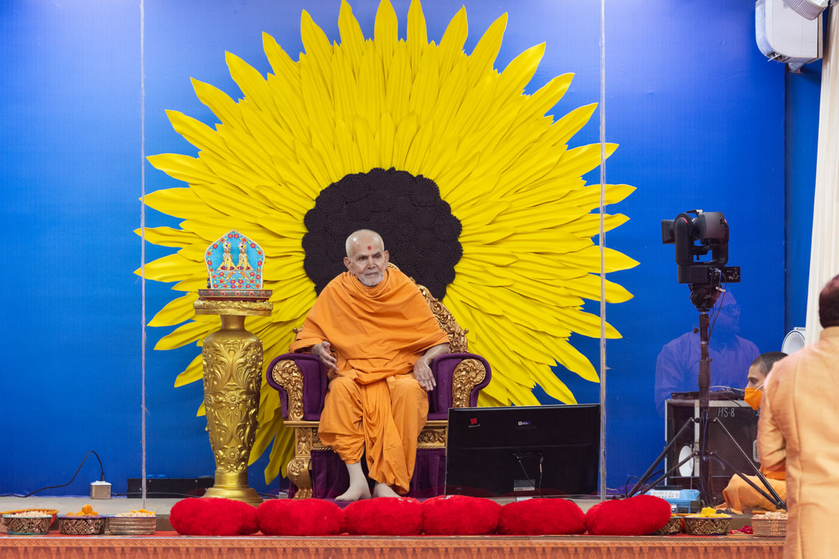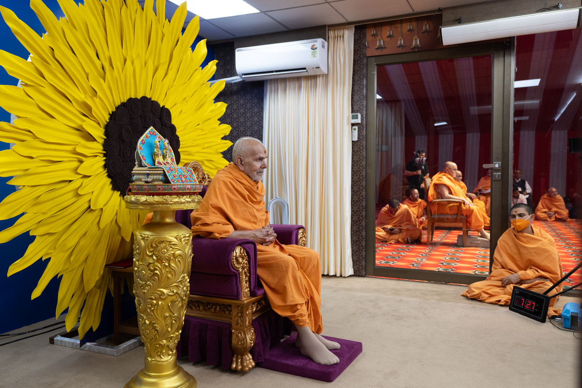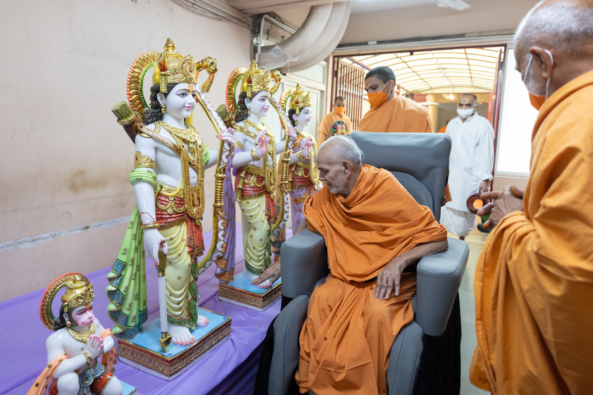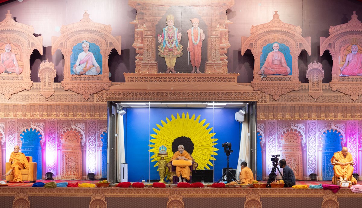 Pujya Ishwarcharan Swami, Pujya Viveksagar Swami and swamis doing Swamishri's puja darshan