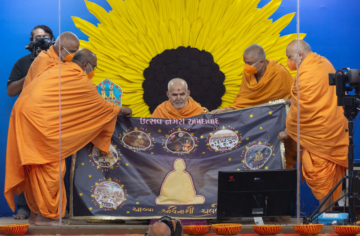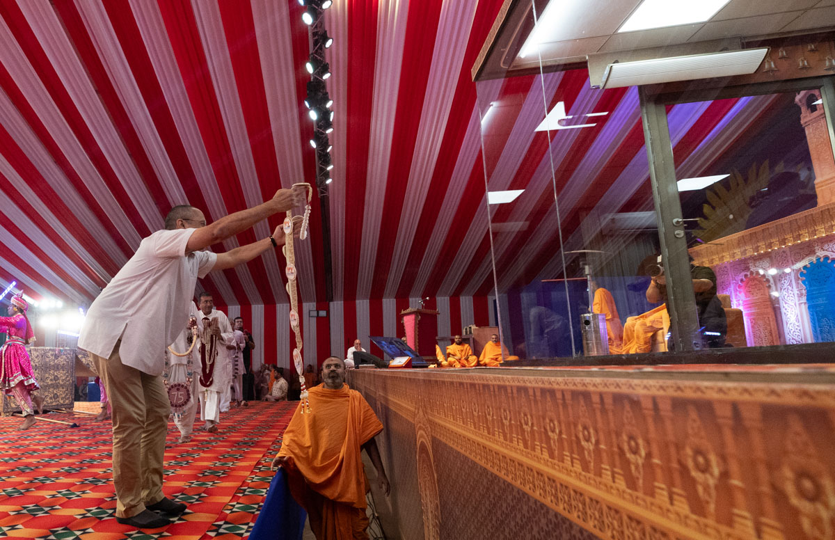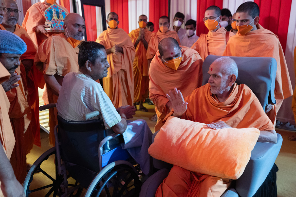 Pujya Ishwarcharan Swami, Pujya Viveksagar Swami and swamis doing Swamishri's puja darshan