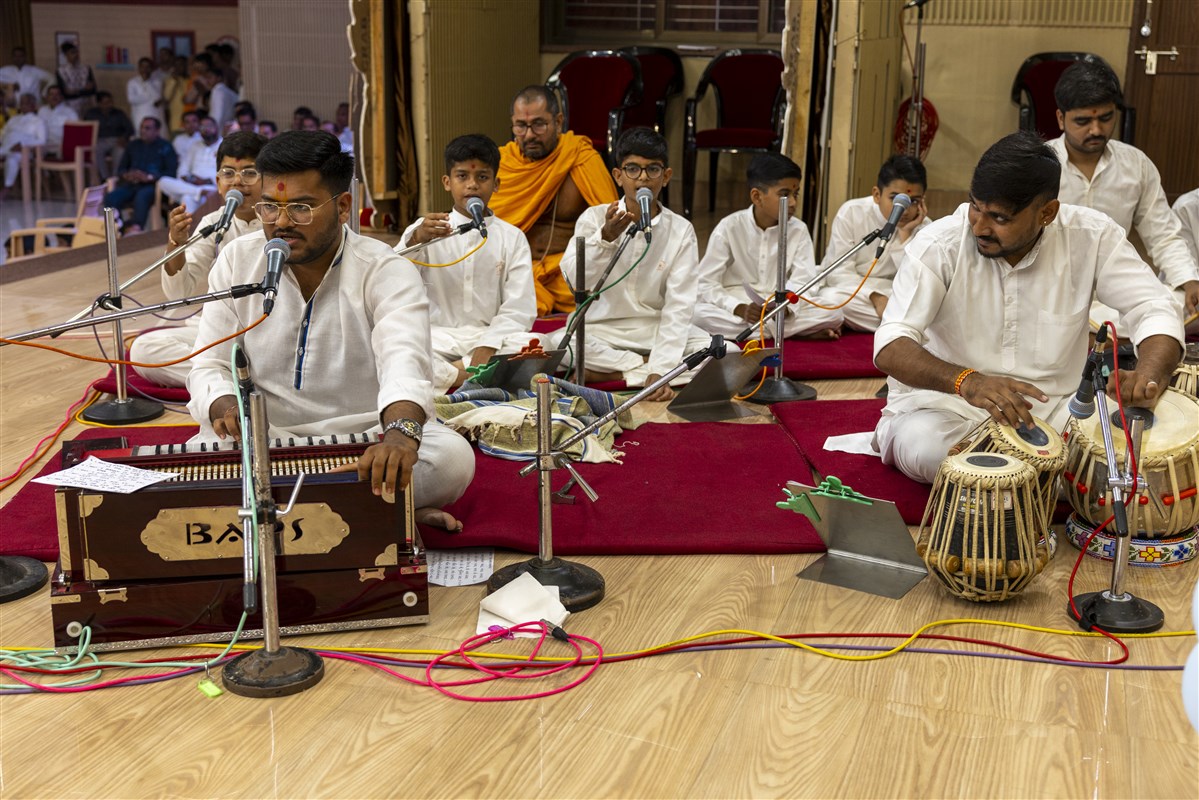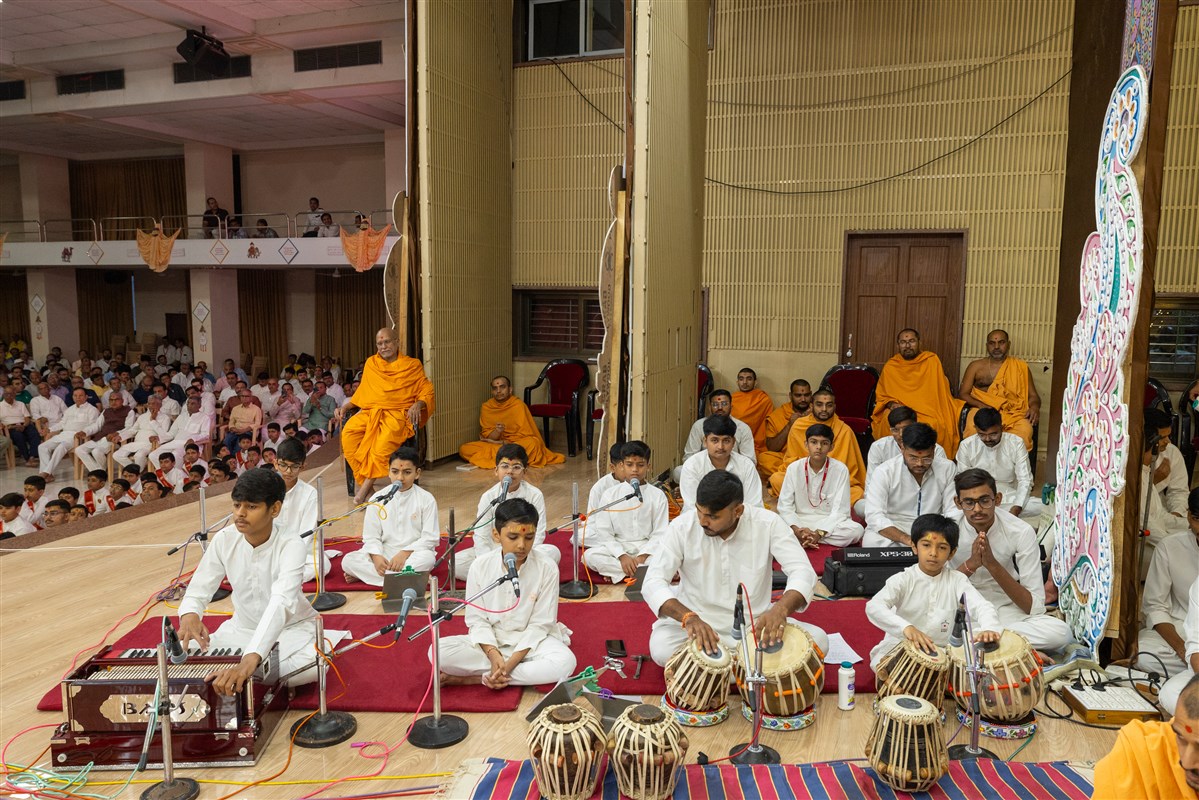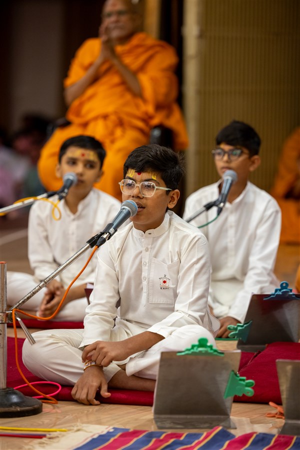 A karyakar and balaks sing kirtans at the beginning of the Bal Din assembly