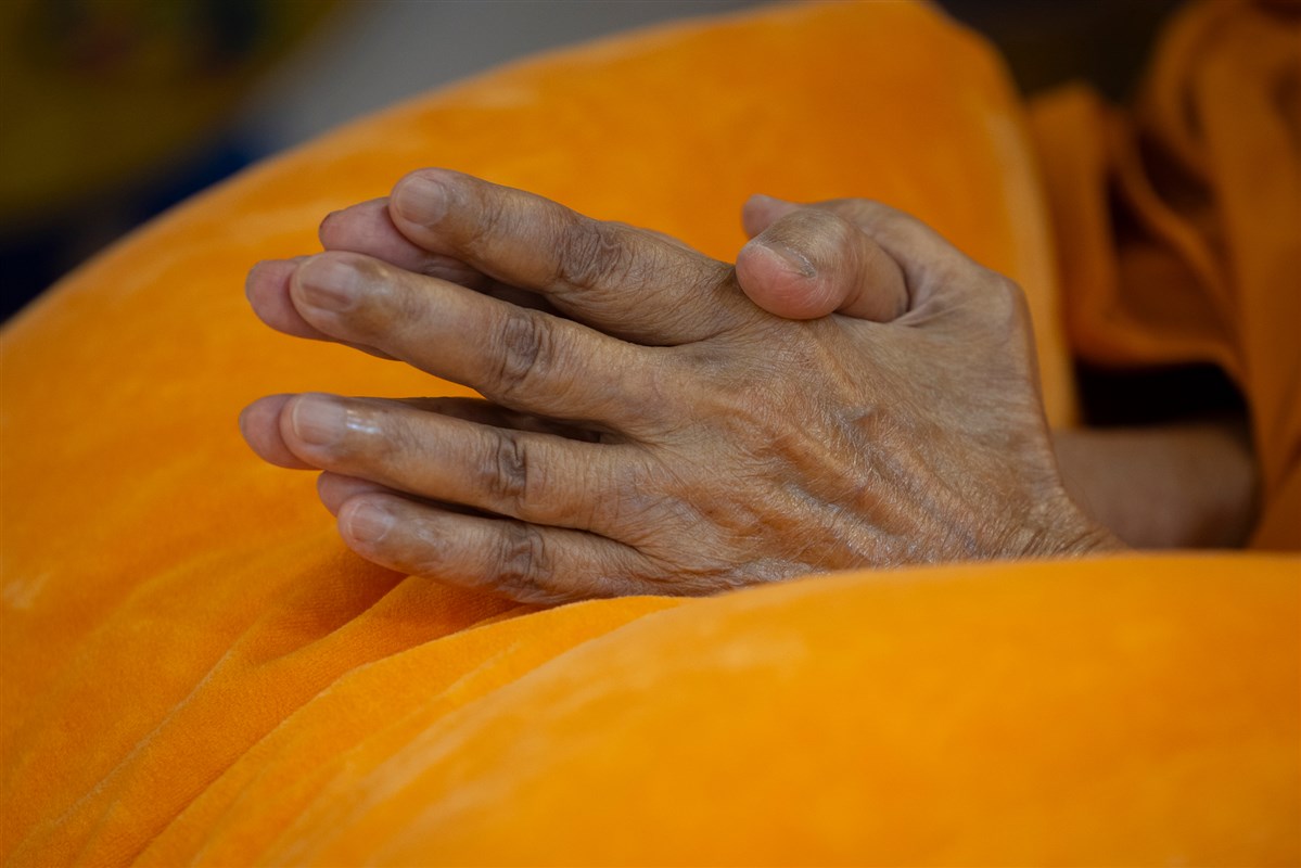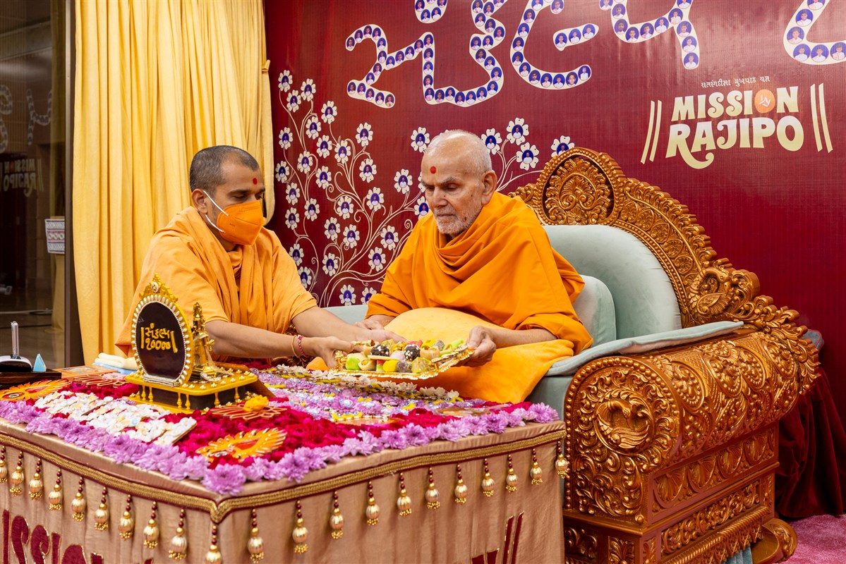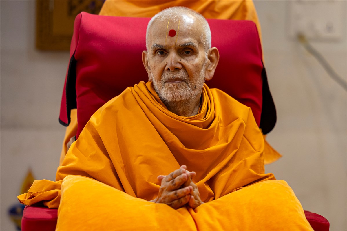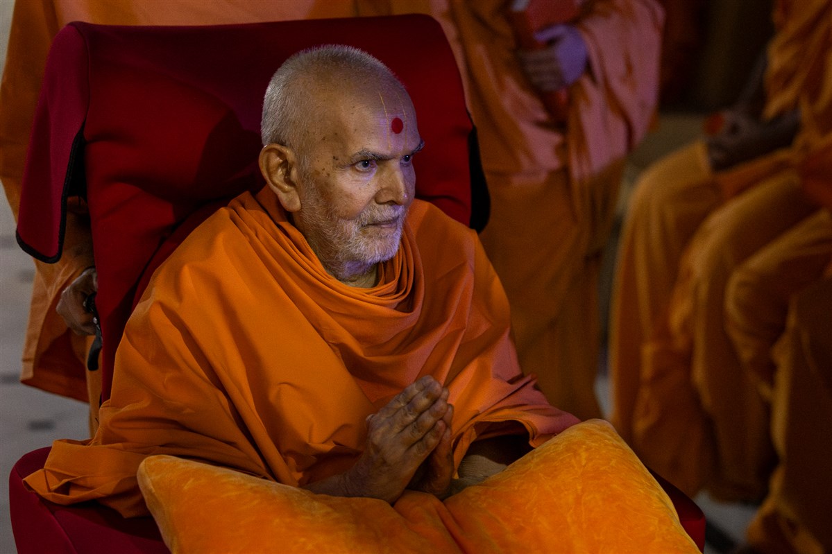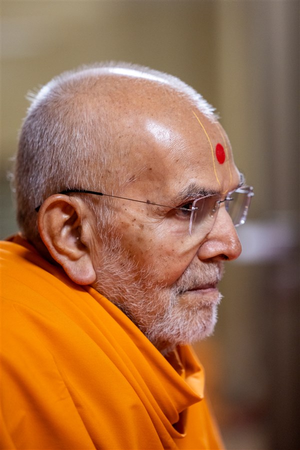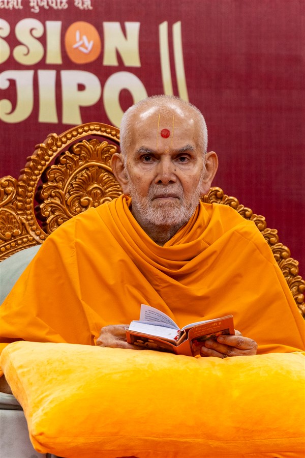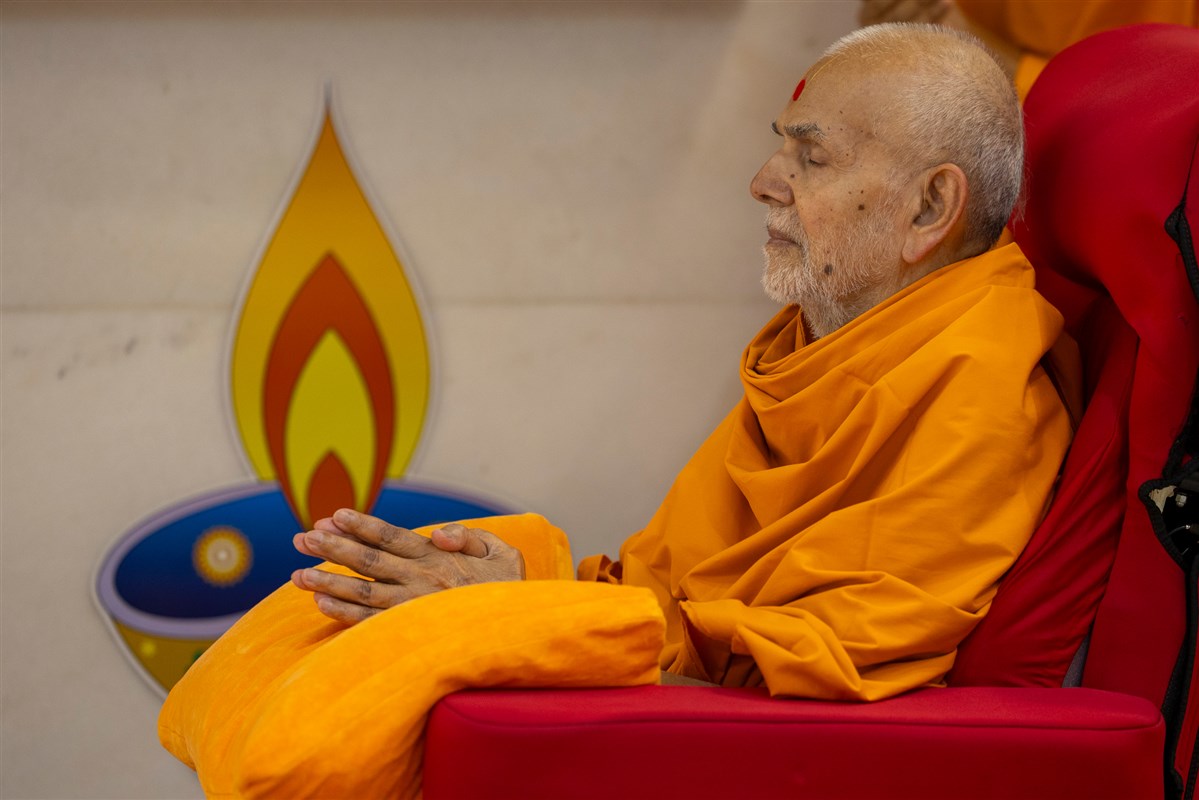 Swamishri listens to the sadhana mantra and daily prayer