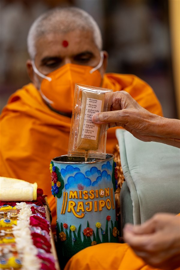 Swamishri sanctifies water with the holy relics of Bhagwan Swaminarayan and the Guru Parampara