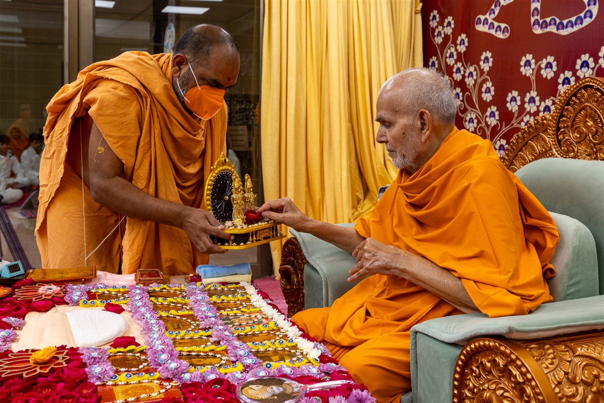 Swamishri offers thal to Shri Guru Parampara