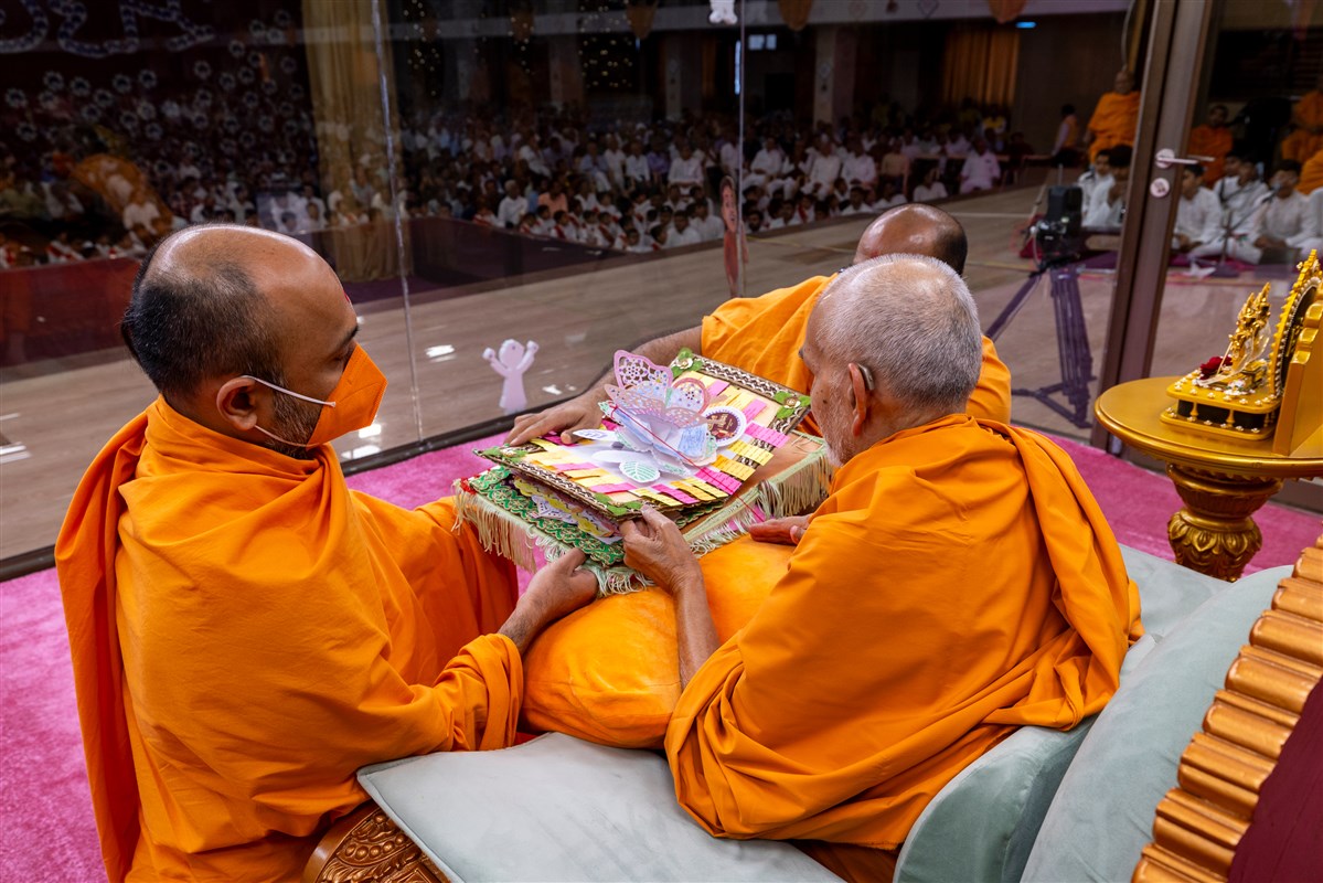 Swamishri observes an invitation card for the evening Bal Din assembly