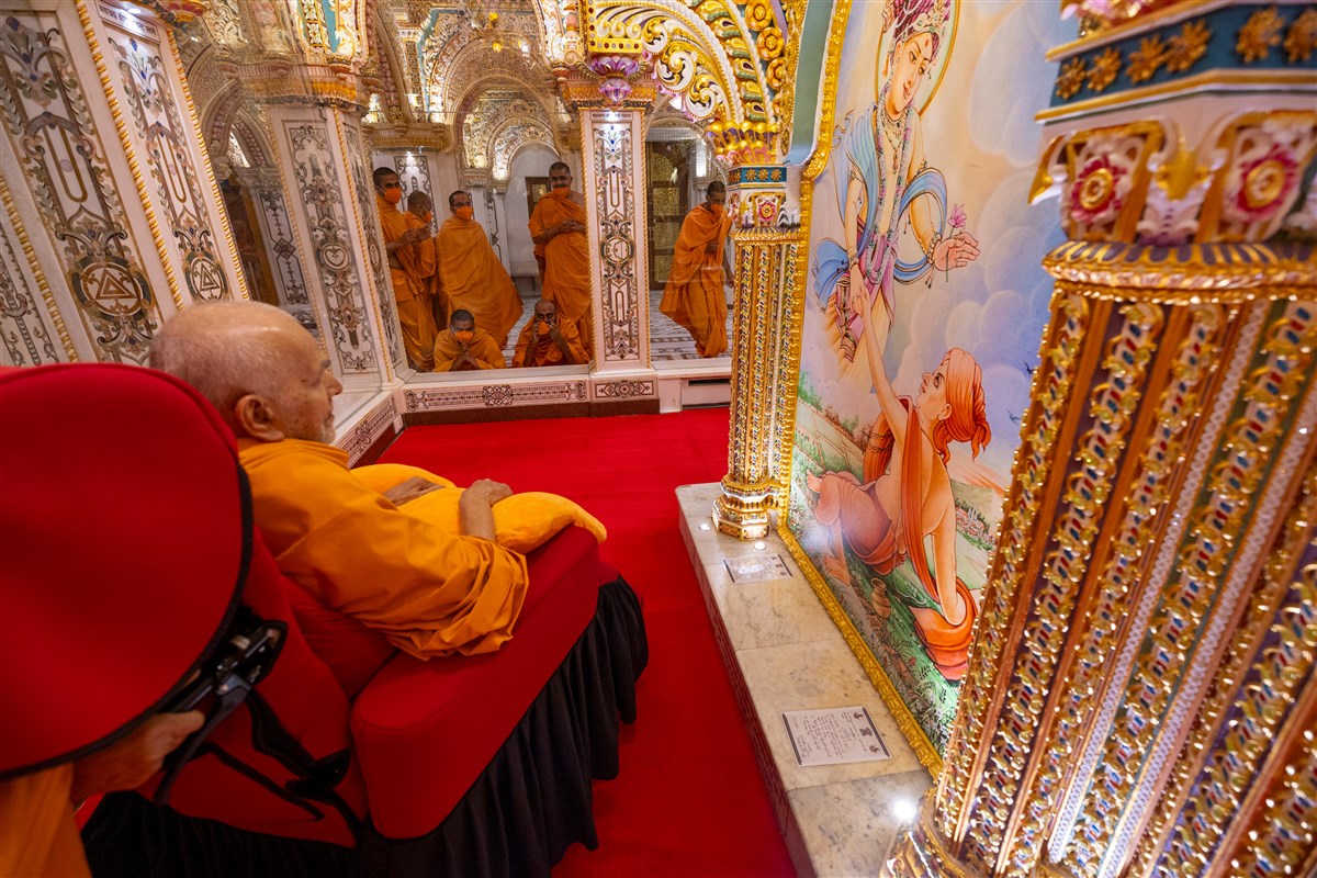 Swamishri engrossed in darshan of the Akshar Deri