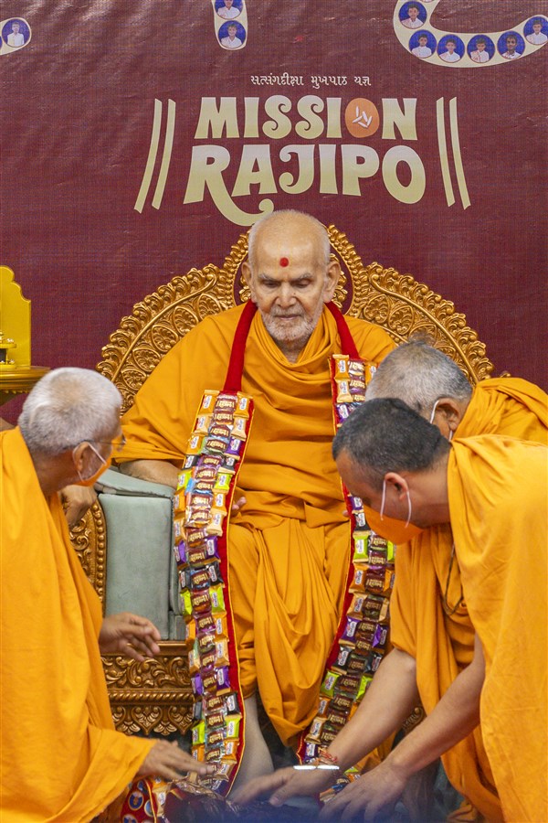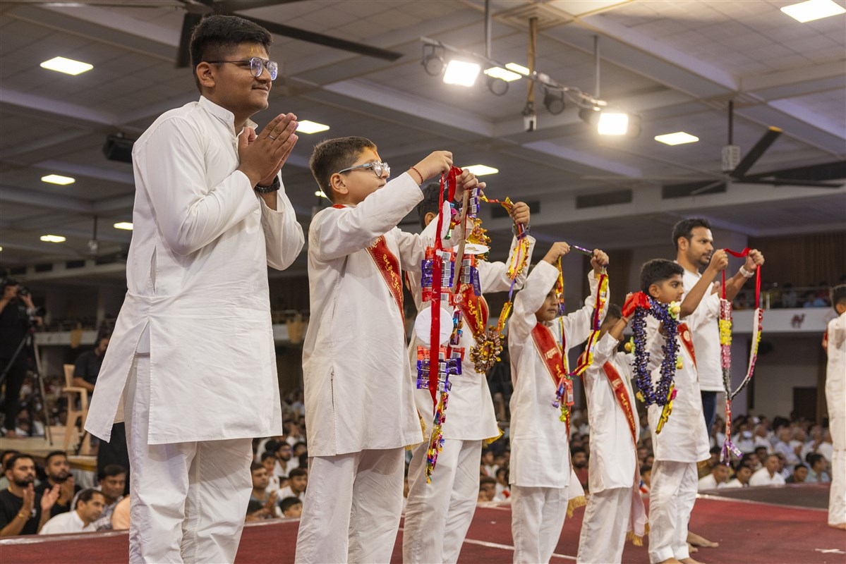 Balaks honor Swamishri with garlands