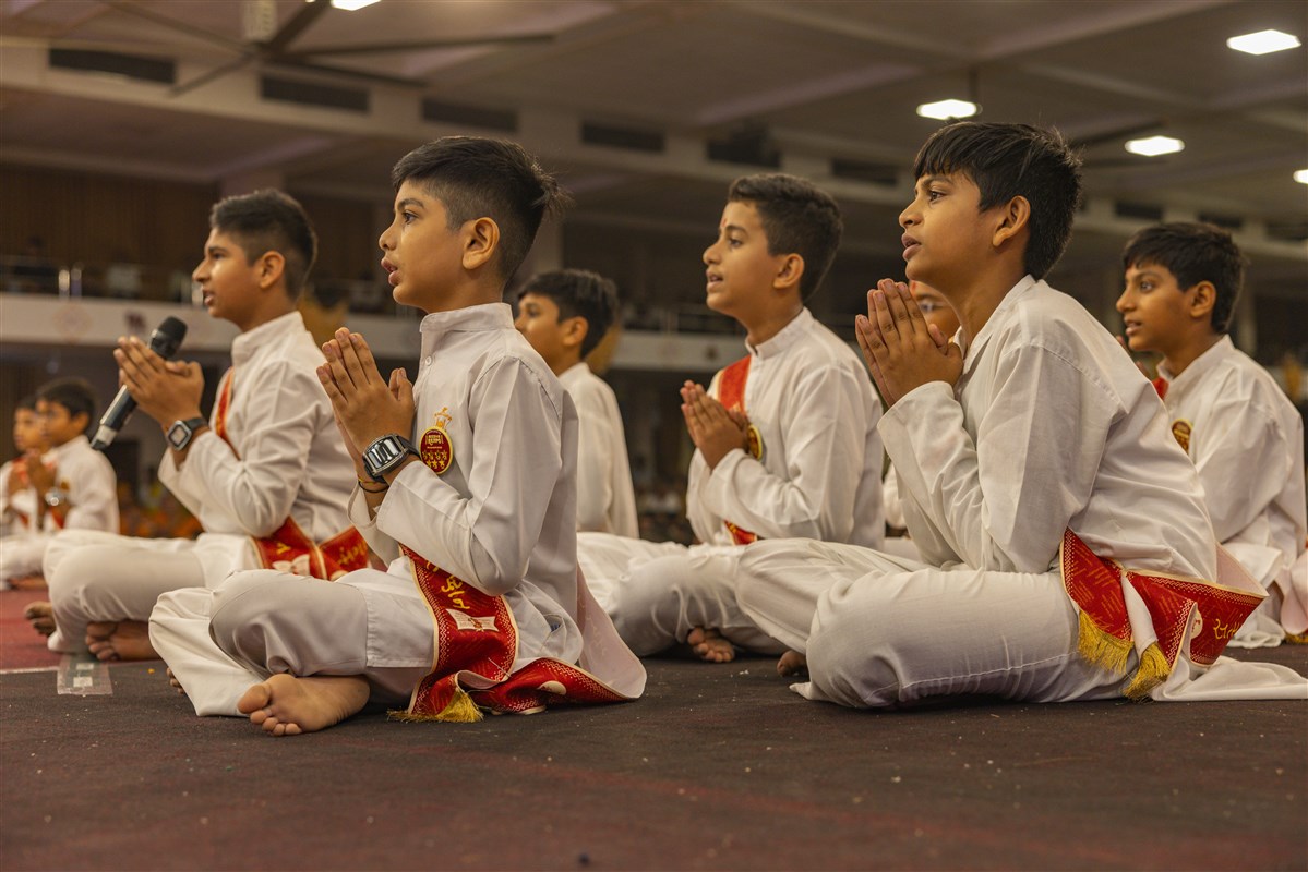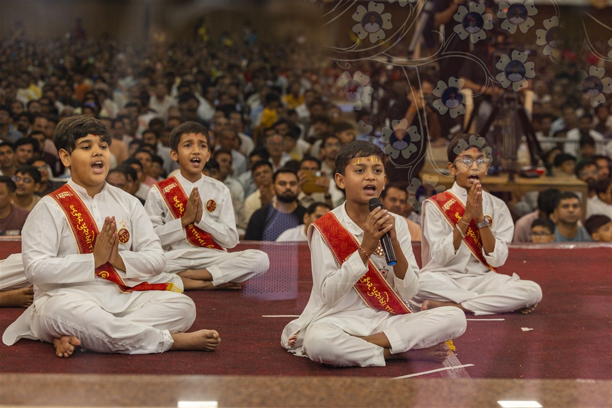 Children recite Satsang Diksha shlokas in Swamishri's puja